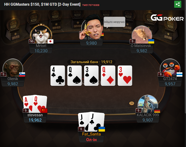 1️⃣Я відкрив JJ 3bb з SB, китайський спортсмен на BB, по призових на GG був схожий на любителя, відразу запушив, дуже дивним мені здався його пуш і я вирішив колоти... Поїхали в монетку JJ v AQs і з гіпершвидкістю я покинув турнір