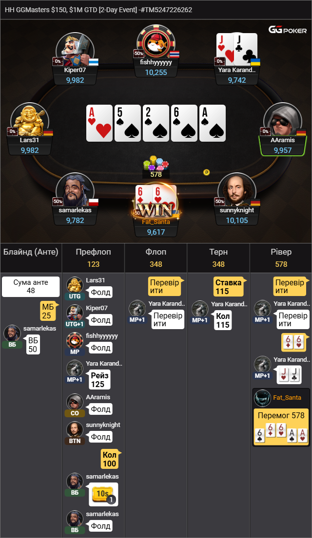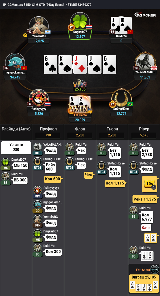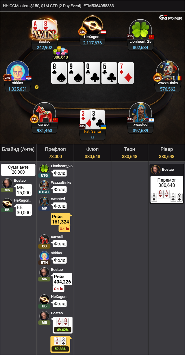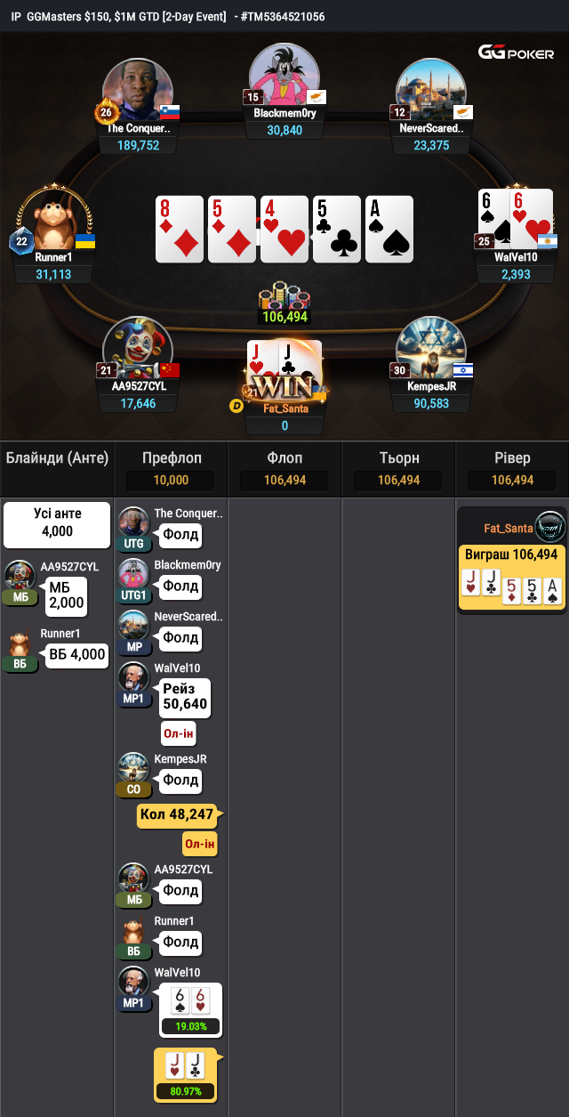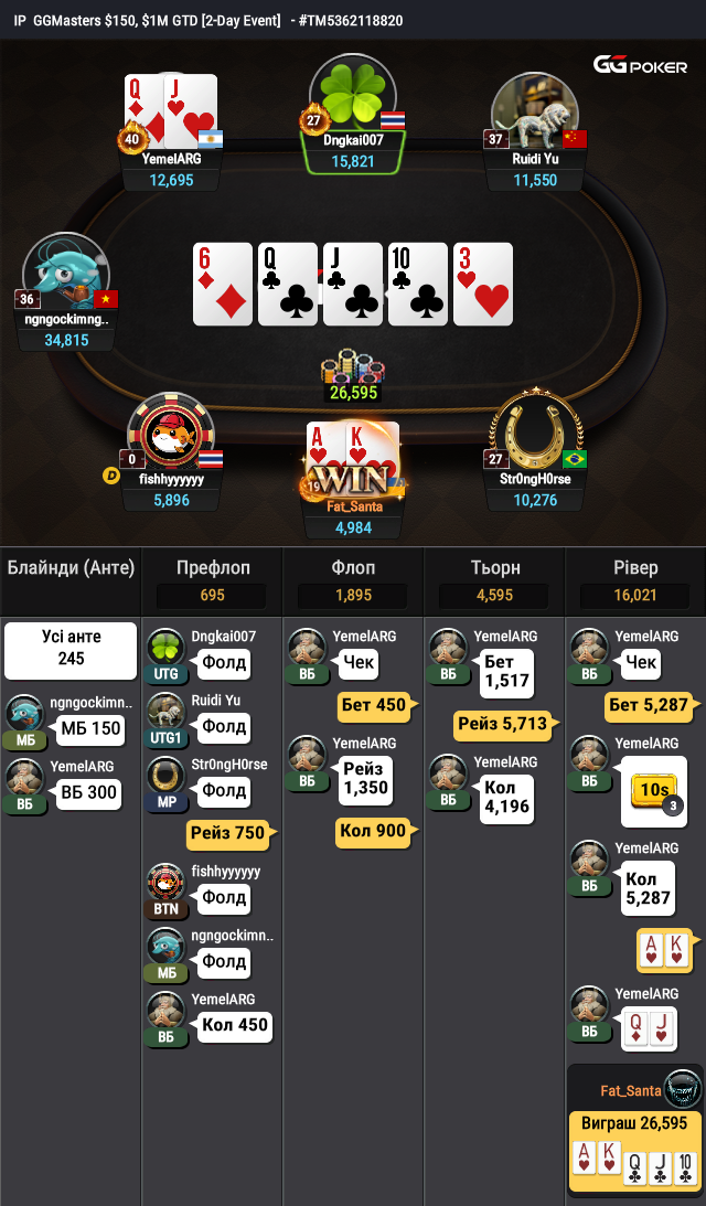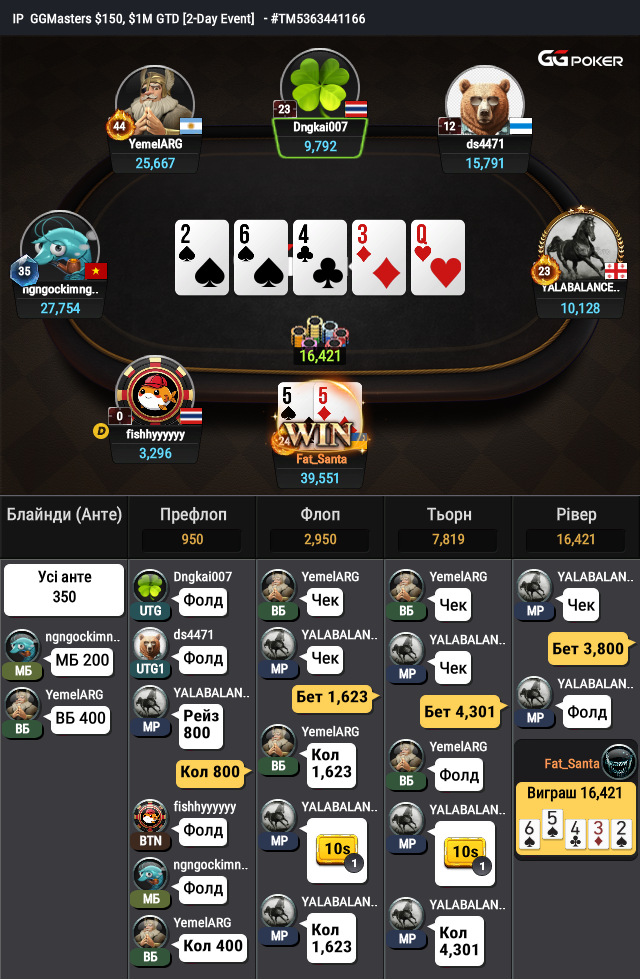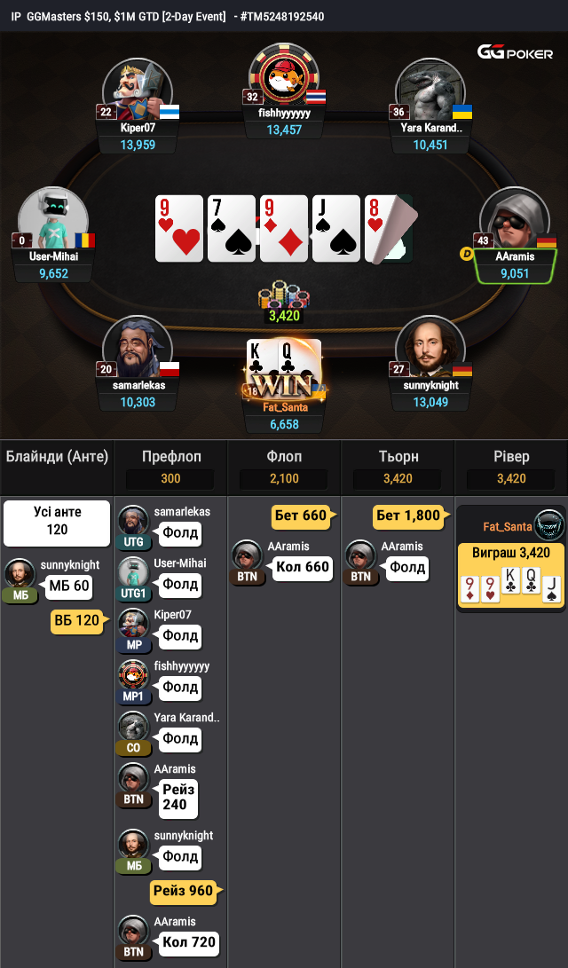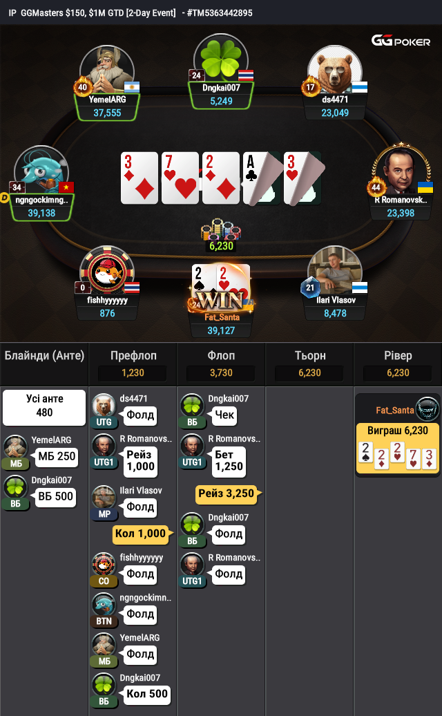 Рівер закриває мені фул-хаус і я знову чекаю в надії, що опонент поставить з тузом, флешом чи в блеф, але український спортсмен також прочекав.