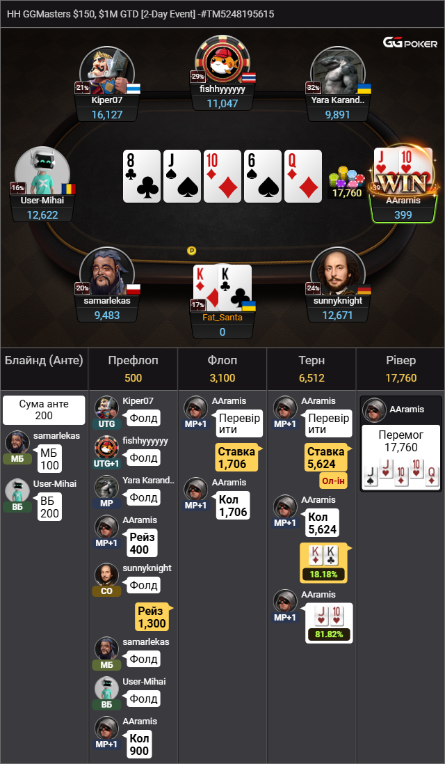 3️⃣ Але доля розпорядилась так, що саме цей агресивний любитель, який розігрував багато рук, та втратив 70% стека в першій роздачі відколивши по четвертій парі, мене й вибив.