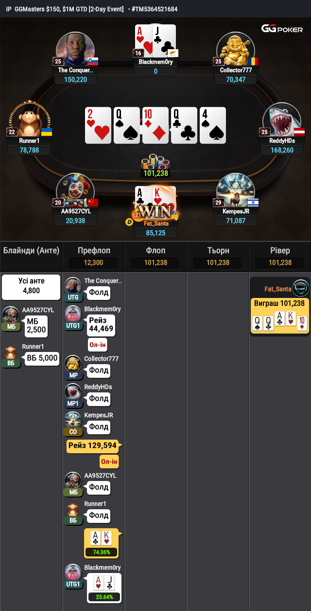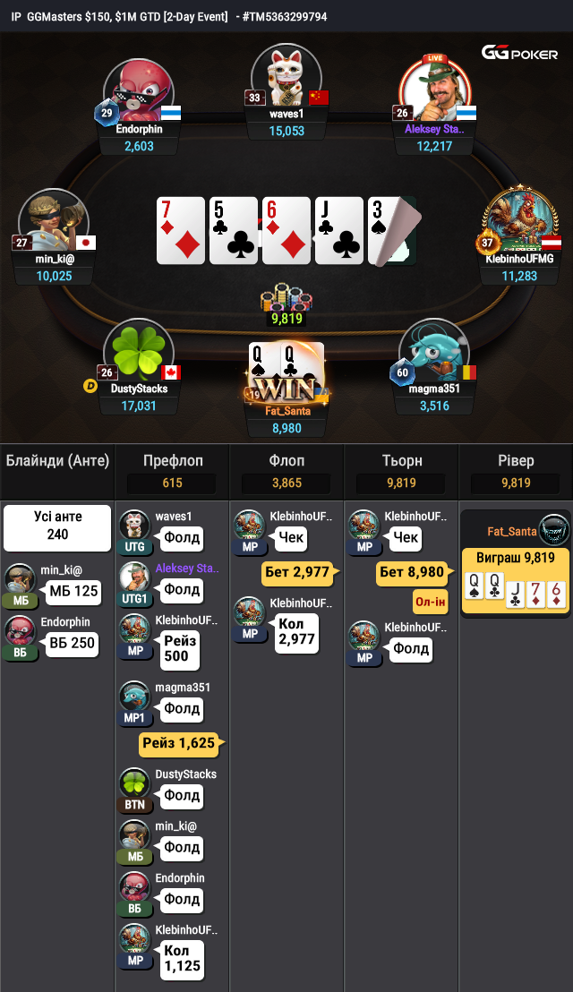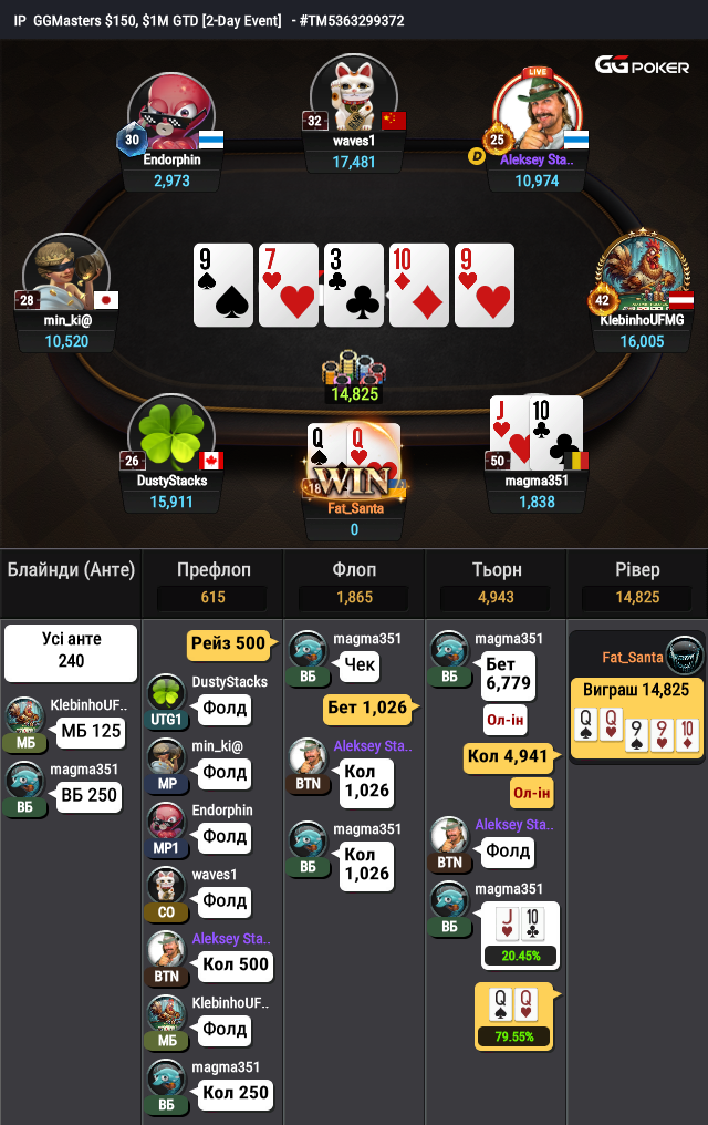 2️⃣ Ставлю 3-В на CO з QQ проти MP, Опонент-чек, ставлю 75% по флопу - опонент заколив, тьорн став дуже небезпечним, ще й поїхало друге ФД, ставлю Ол-ін. Фух, пронесло😅