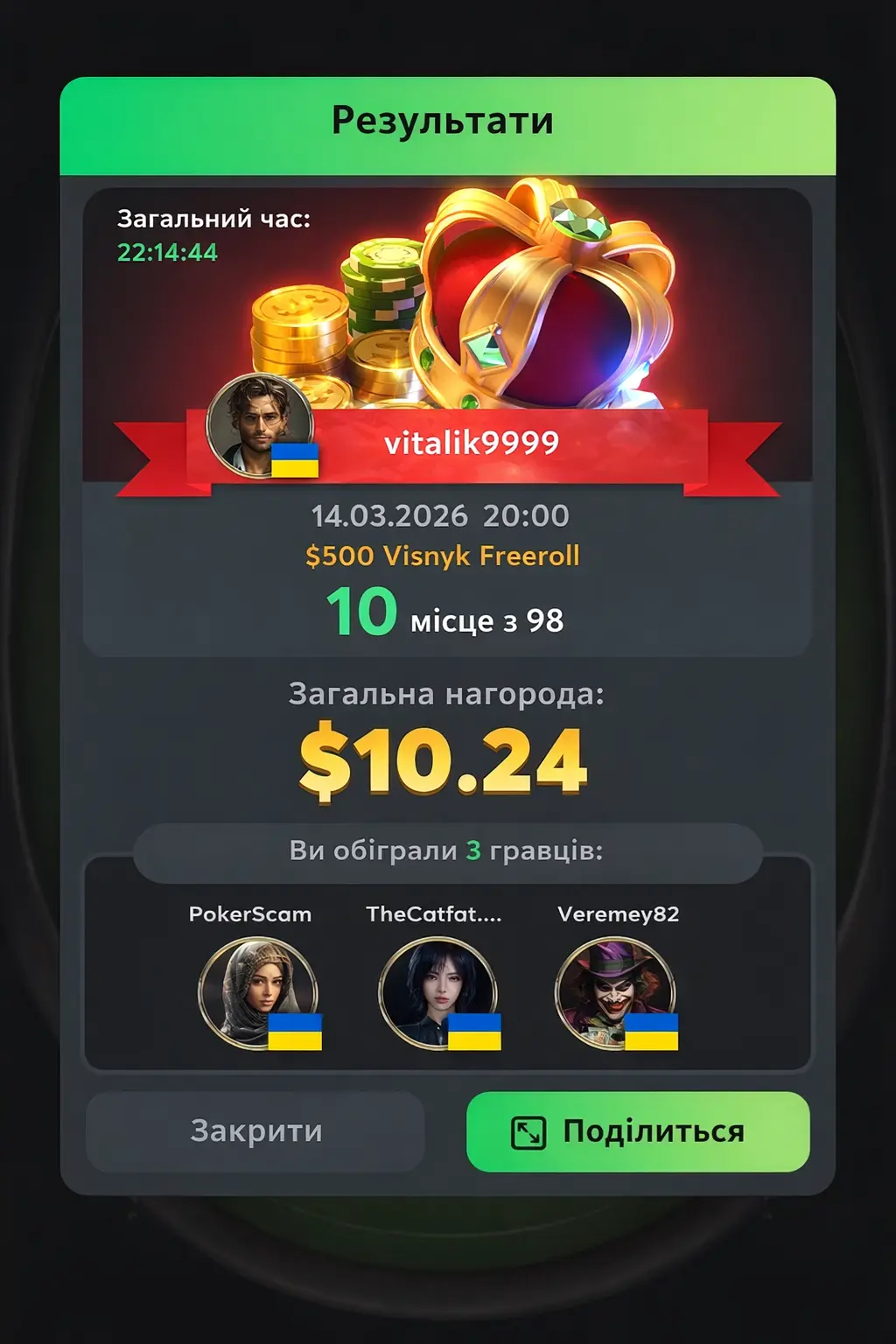 Так, це не фінальний стіл і не великий занос, але приз $10.24 невеликий, проте приємний бонус за вечірню катку.