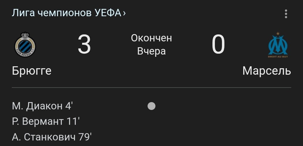 Вчора Брюге розгромив Марсель з рахунком 3:0,і зайняв 19 місце у турнірній таблиці з 10 очками і зіграє в плей-офф 1/16 фінала,Марсель опинився на 25-й позиції с 9 балами і залишився без плей-офф...