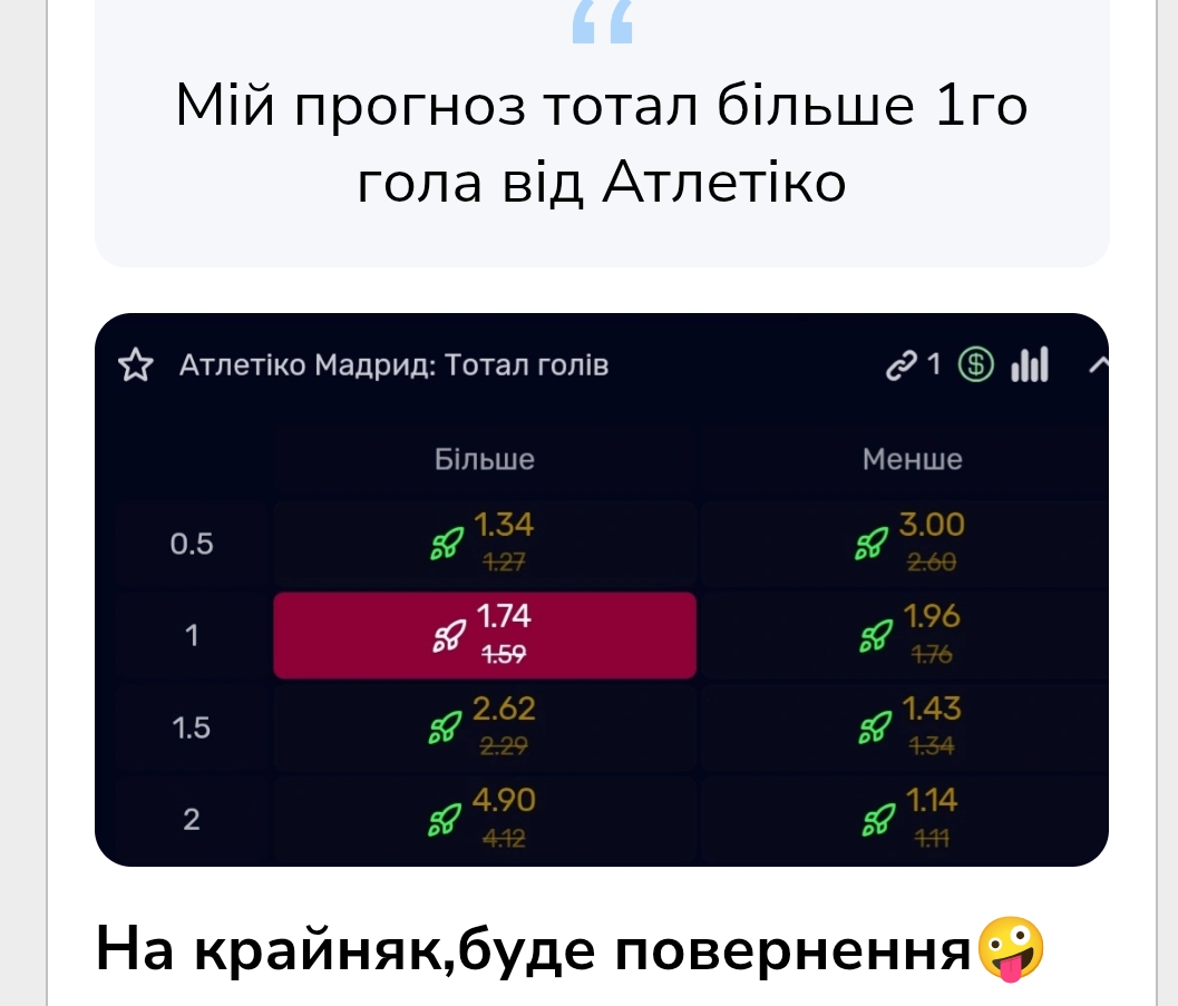 Мій прогноз тотал більше 1го гола від Атлетіко