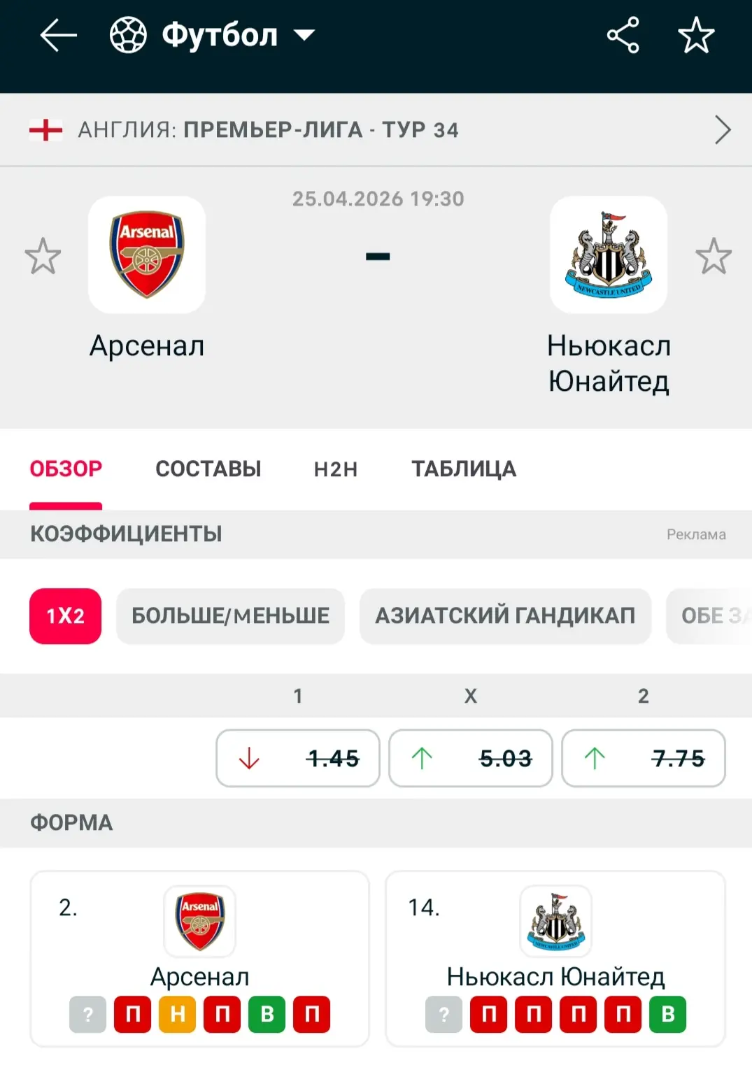 Зважаючи на слабку гру Ньюкасла на виїзді та їх кадровий дефіцит, фора -1,5 на Арсенал виглядає логічним вибором, особливо на домашньому стадіоні "Емірейтс".