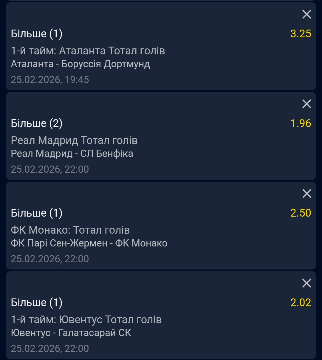 Вчорашні матчі мене здивували Буде переміг Інтер на виїзді це був шок😱 В Баєр з Оліпіакосом просто 0:0 без інтриг без рубки . Про матчі Ньюкасла - Карабах і Атлетіко Мадрид - Брюгге мовчу чудово було зіграні матчі. Експрес який вчора робився злетів але нічого сьогодні новий день і потрібно брати по максимуму.