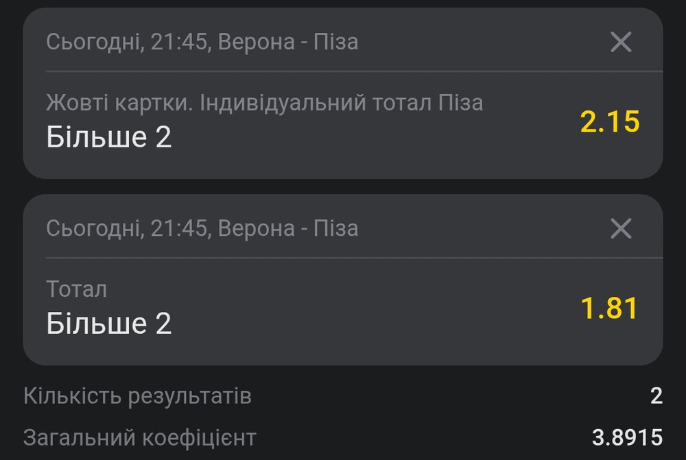 🟨 Жовті картки. ІТ Піза більше 2 (кф 2.15)