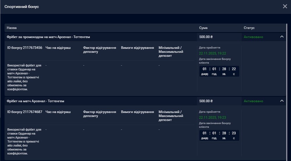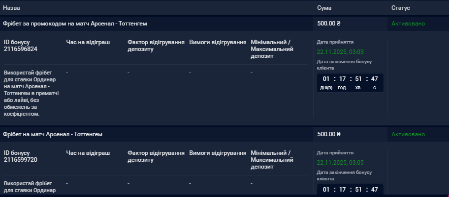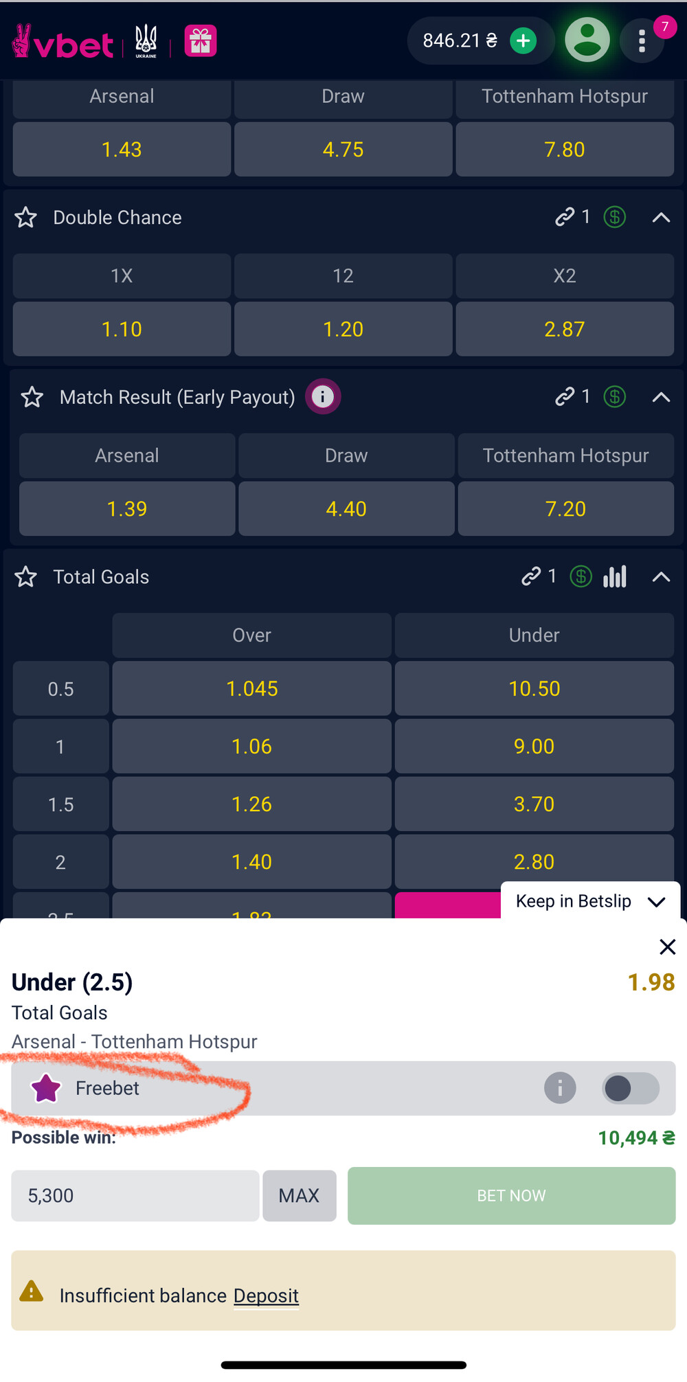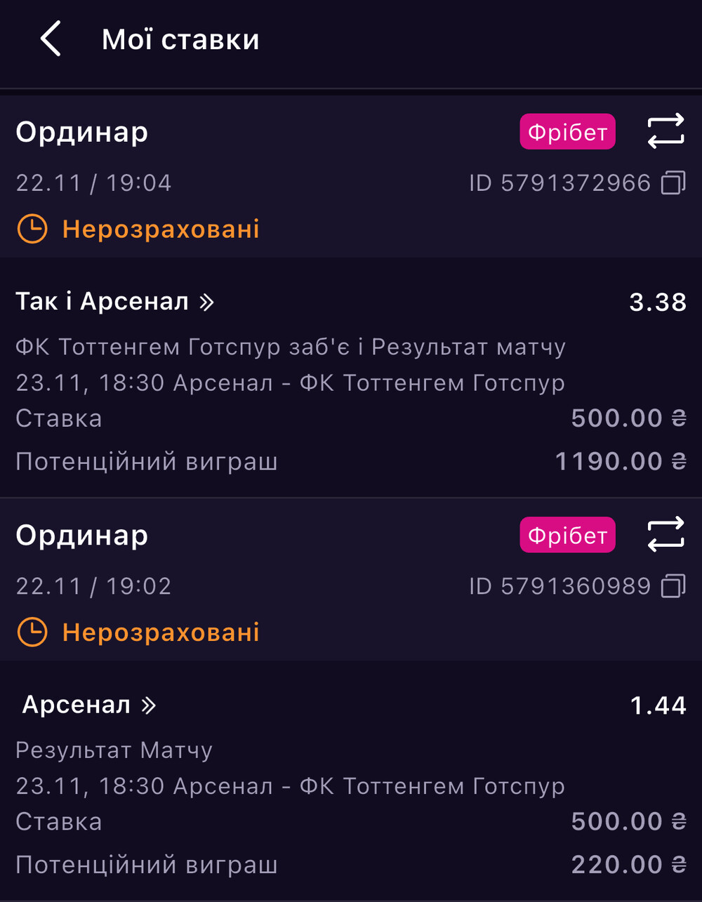 я взяв Фора мінус 1 на Арсенал, а другим фрібетом Фора +1,5 на Тотенхем,