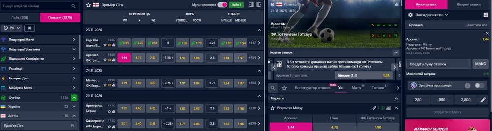 Ставити можливо тільки 1 матч я поставив ТБ 2,5 другий Тотенхем плюс 1.5 хоч є можливість поставити одразу і більше 2.5 і меньше але не знаю можливо забанять