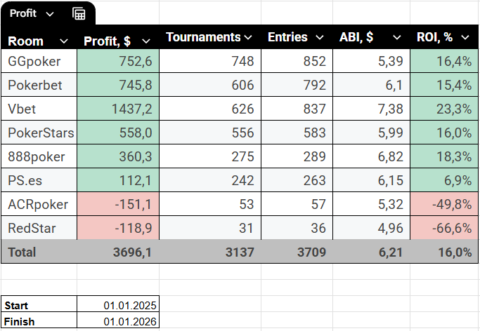 Не так давно я писав про свої результати в 2025 році. І після перегляду цього відео мені теж захотілося спробувати такий спосіб оцінки. Відсіяти найбільші призові виялось не так просто. Бо тут така штука: мій найбільший занос в 2025 це виграш Silver Pass на PS вартістю 2,5к баксів, який я обміняв на пачку квитків по 215, 109, 55 і 22. Отже ці турніри я би теж не грав, якби не той виграш. Тож довелося знайти всі ці турніри і відфільтрувати. Ось такі вийшли результати: