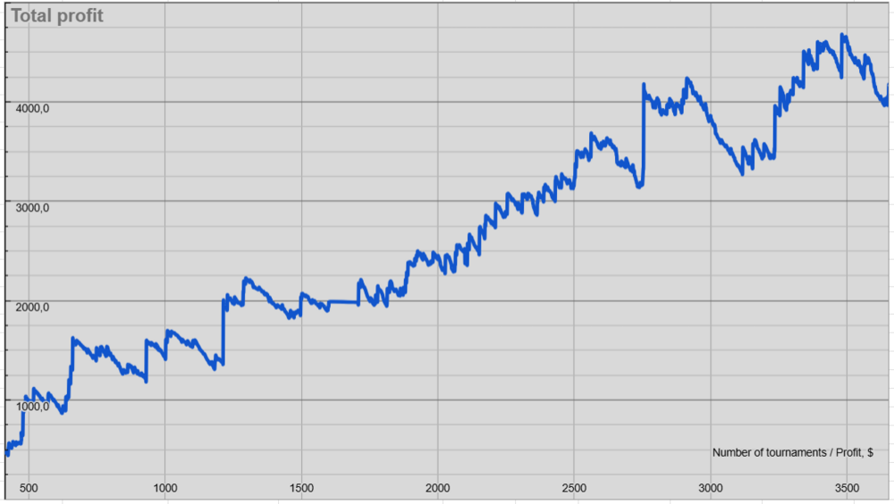 2. Графік все одно плюсовий, проте кут нахилу вже доволі слабкий (приблизно 4% - 9% ROI) - щось ви робите правильно, проте йти вище зараз не варто, можливо краще ще трохи відточити свою майстерність на цьому ліміті і переглянути рішення пізніше.