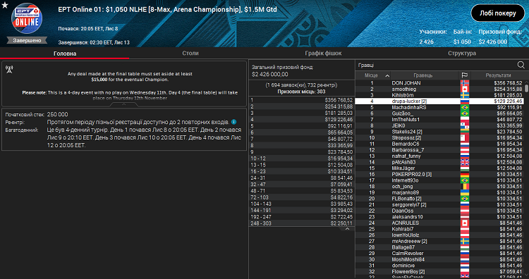 Покеристи з Росії продовжують вигравати великі призові на EPT Online 2020. Цієї ночі завершився турнір EPT Online 01 Arena Championship з бай-іном 1 050$ і гарантованими призовими в 1 500 000$.