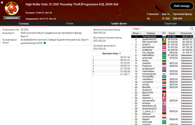 Нокаут-турнір High Roller Club зібрав 66 входів, які сформували призовий фонд у розмірі 66 000$.