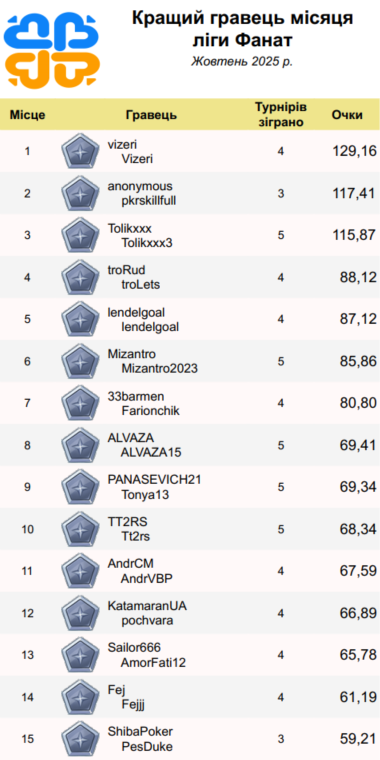 Враховуються ТІЛЬКИ результати турнірів ліги "Фанат" поточного місяця, якщо гравець зі статусом "Фанат" протягом місяця грав також у інших лігах, його результати враховуються у місячний рейтинг відповідної ліги.