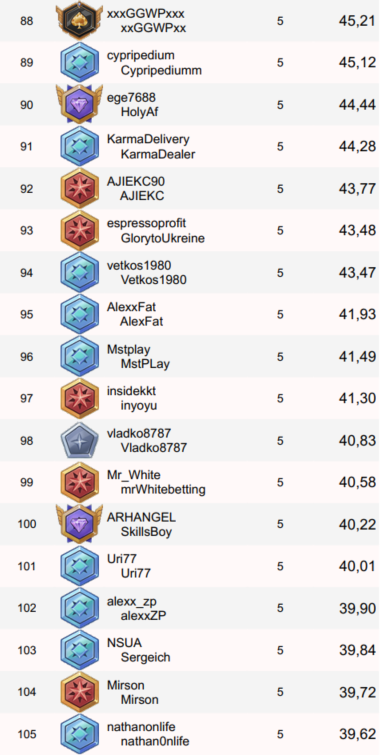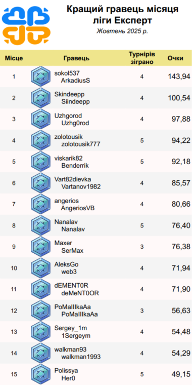 Враховуються ТІЛЬКИ результати турнірів ліги "Експерт" поточного місяця, якщо гравець зі статусом "Експерт" протягом місяця грав також у інших лігах, його результати враховуються у місячний рейтинг відповідної ліги.