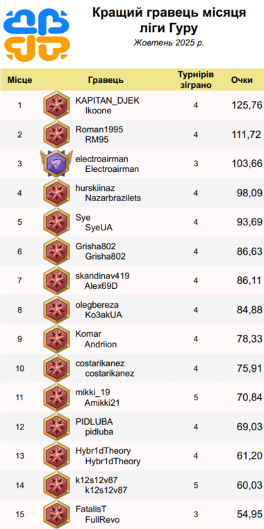 Враховуються ТІЛЬКИ результати турнірів ліги "Гуру" поточного місяця, якщо гравець зі статусом "Гуру" протягом місяця грав також у інших лігах, його результати враховуються у місячний рейтинг відповідної ліги.