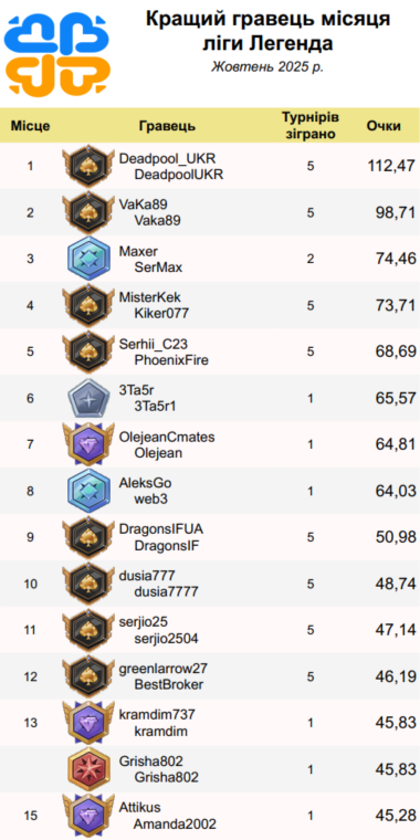 Враховуються ТІЛЬКИ результати турнірів ліги "Легенд" поточного місяця, якщо гравець зі статусом "Легенда" протягом місяця грав також у інших лігах, його результати враховуються у місячний рейтинг відповідної ліги.