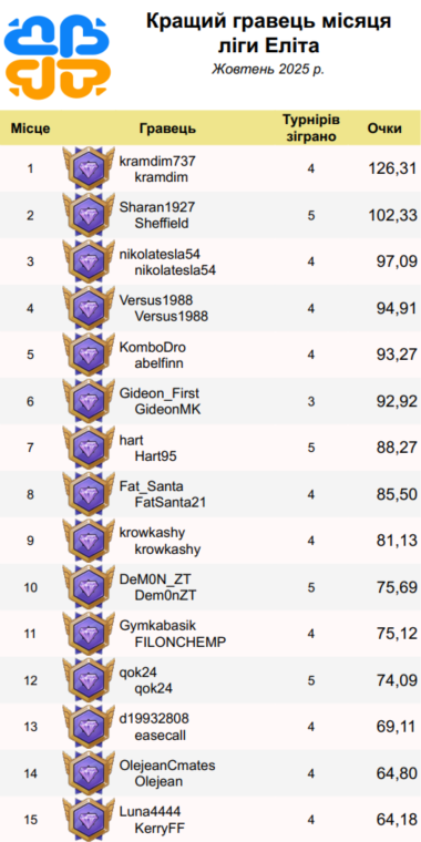 Враховуються ТІЛЬКИ результати турнірів ліги "Еліта" поточного місяця, якщо гравець зі статусом "Еліта" протягом місяця грав також у інших лігах, його результати враховуються у місячний рейтинг відповідної ліги.