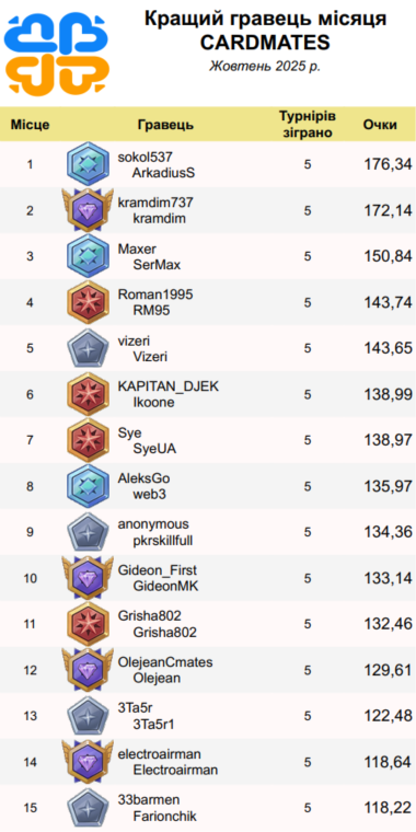 Враховуються УСІ результати турнірів ліг Cardmates поточного місяця.