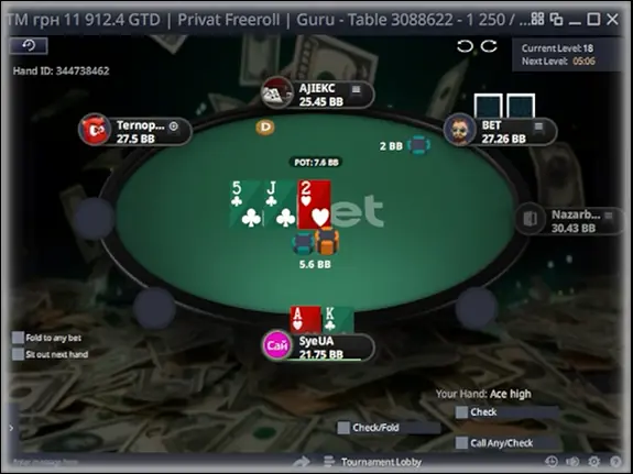 Відкриваюсь з AKo і отримую кол від prizrak503 з SB. На флопі в мене летить донк-бет.