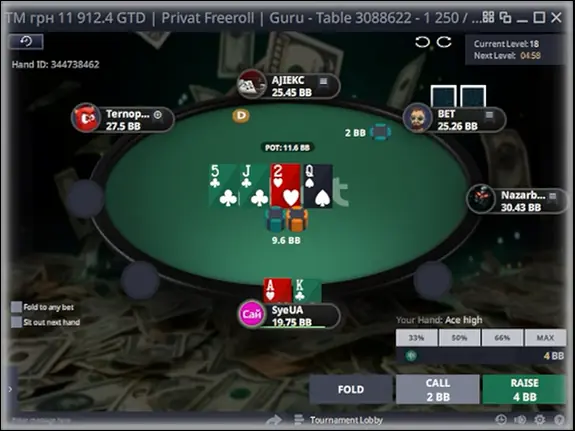 Поки не повилітали відсутні гравці, гра за моїм столом була у форматі 3-макс. Без особливих стрибків дисперсії поступово нарощував кількість своїх фішок.