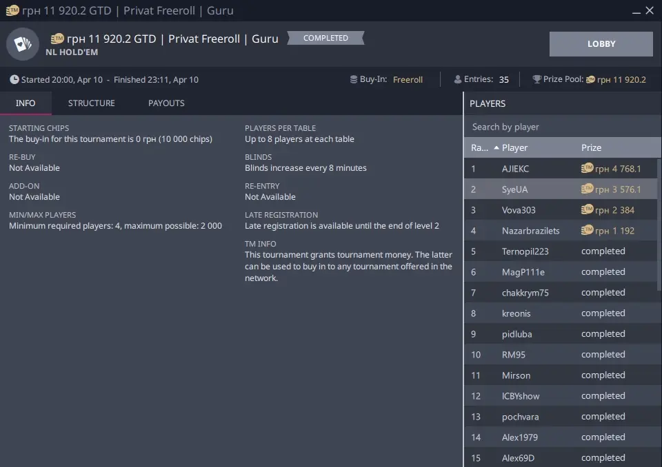 Вийшов на фіналку з другим стеком, де через трохи в одній роздачі вилетіли одночасно двоє гравців і почалась довга боротьба за те щоб потрапити в зону призів.