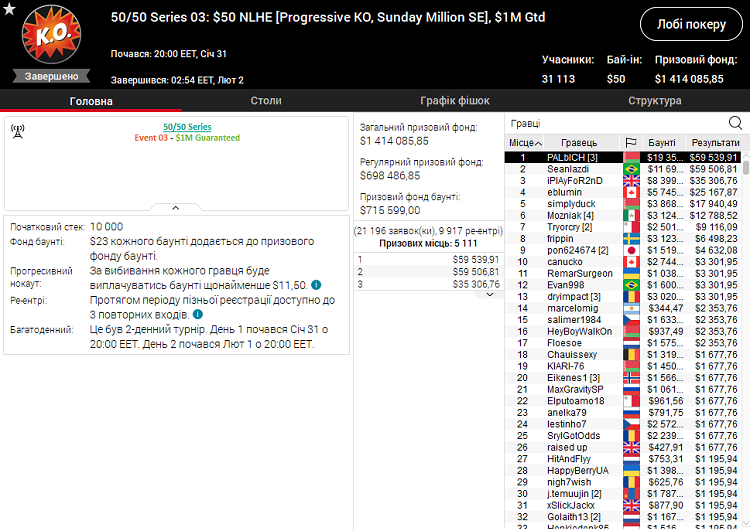 Минулої ночі завершився в рамках серії 50/50 на PokerStars завершився турнір Sunday Million в форматі прогресивний нокаут з бай-іном 50$ і гарантованими призовими в 1 000 000$.
