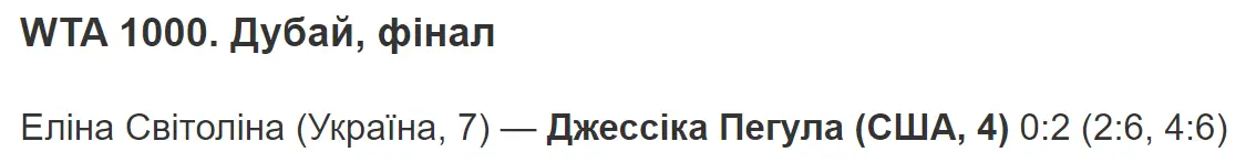 Не можу не згадати виступ в лютому нашої кращої тенісистки Еліни Світоліної. І хоча вона поступилася на турнірі в Дубаї, все рівно вона молодець.