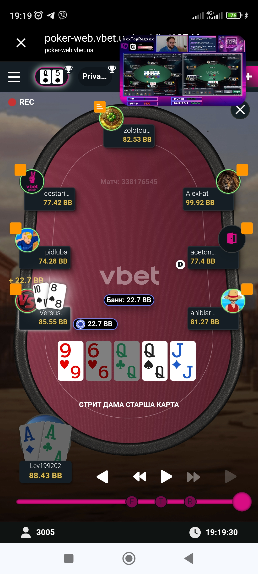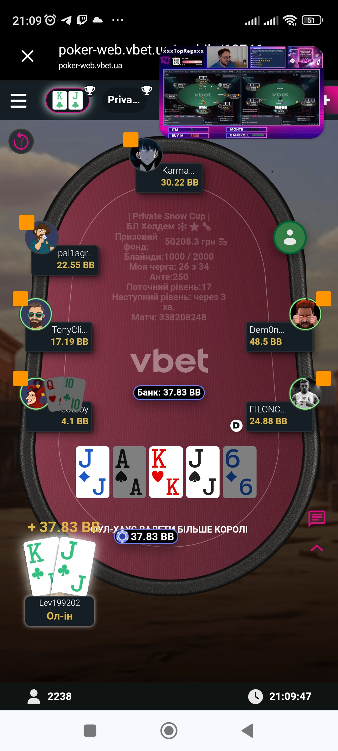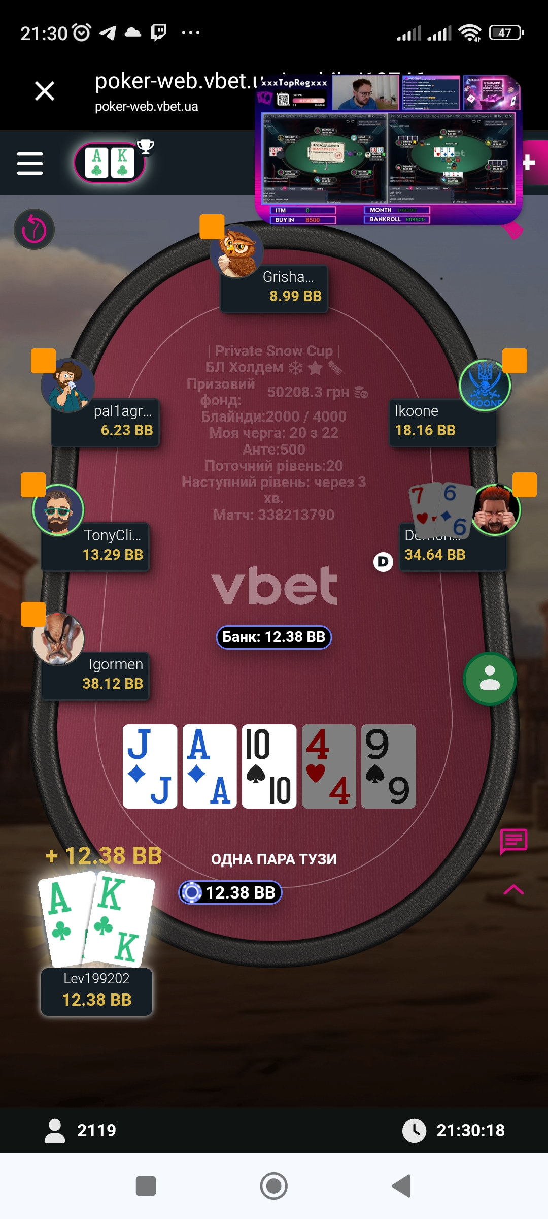 Трохи згодом сталась цікава роздача проти чіпака турніру де я просто запушив в він вколов, і мої 88 виявились сильніші