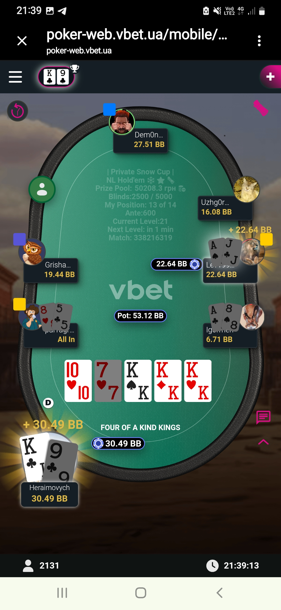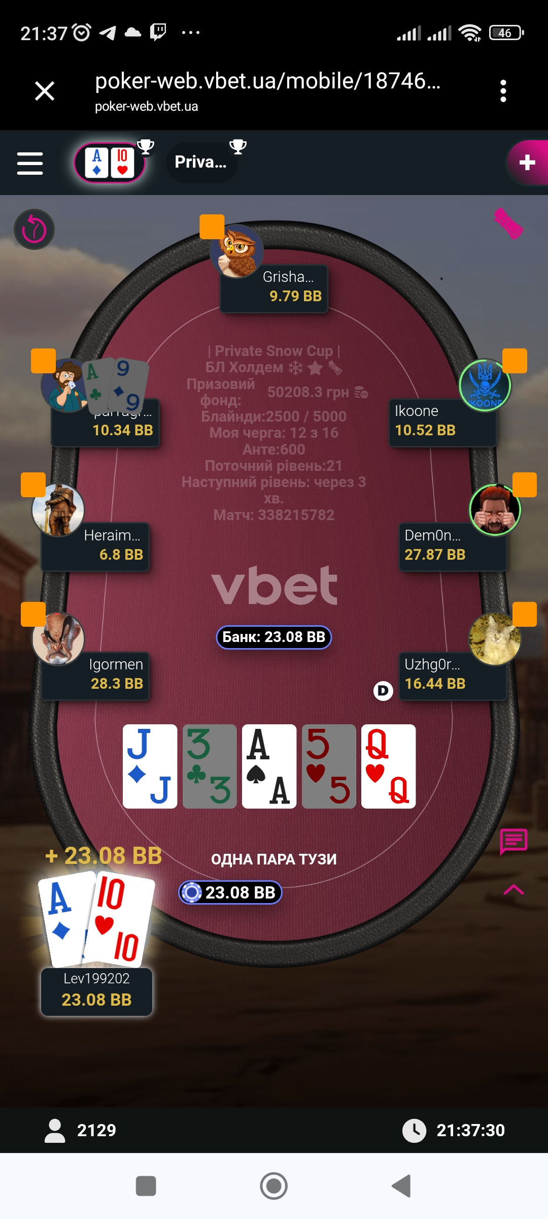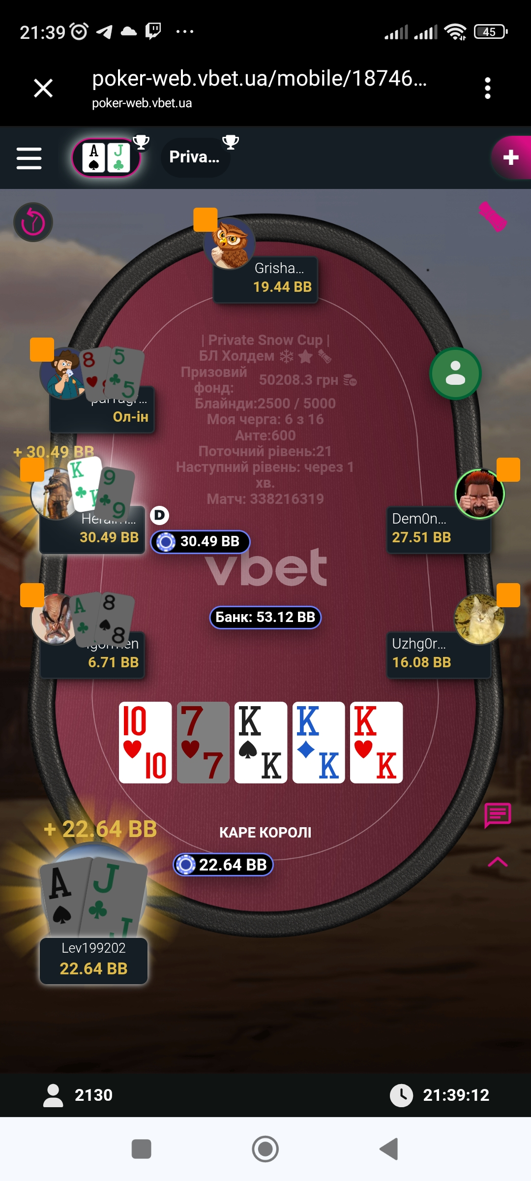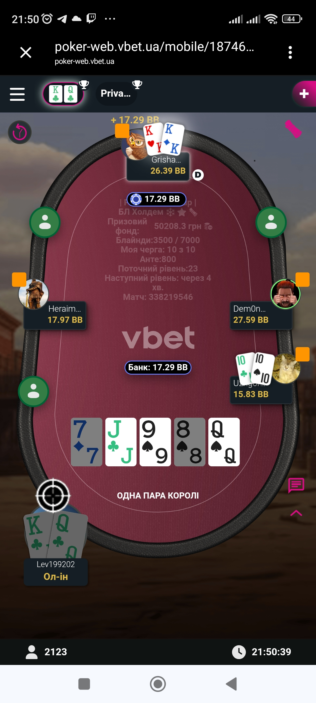 Ну і на великий жаль гра для мене скінчилась на 10 місці де я запушив свої КQs але в Гріші були КК