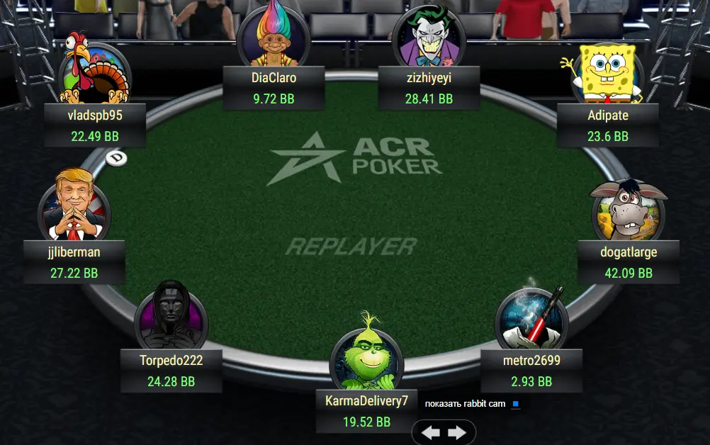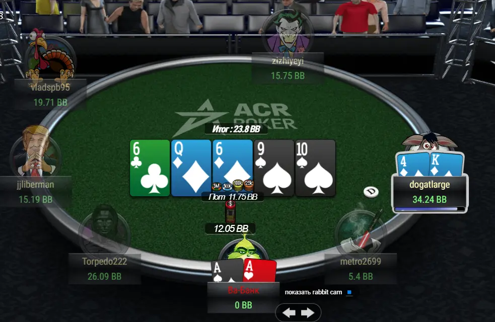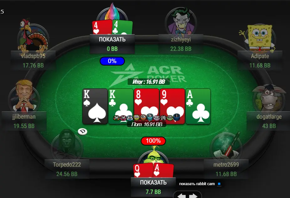 Мої пуші всі дуже сильно поважали. Ставлю ол-ін 4 bb - всі пас, в наступній роздачі ставлю ол-ін 5 bb і знову всі пас.