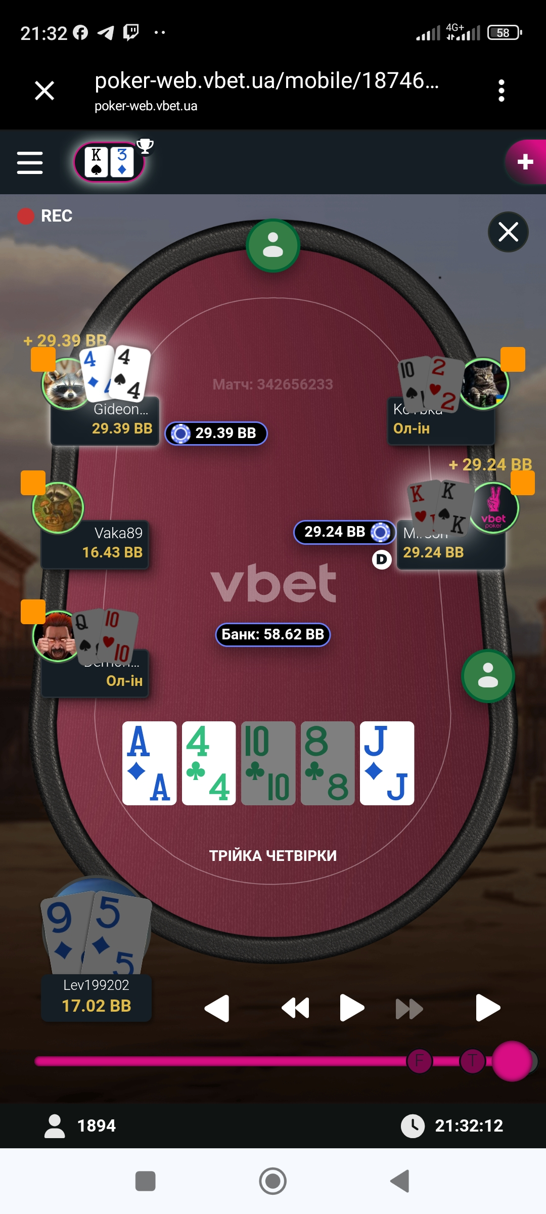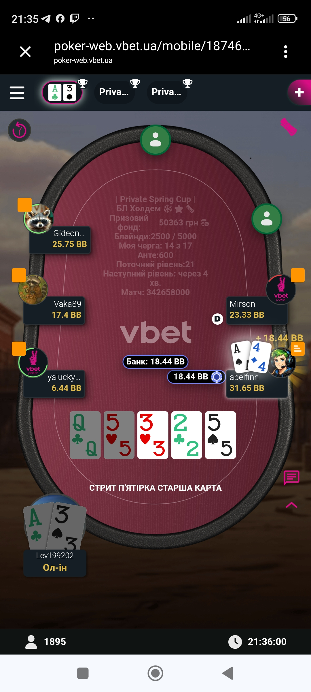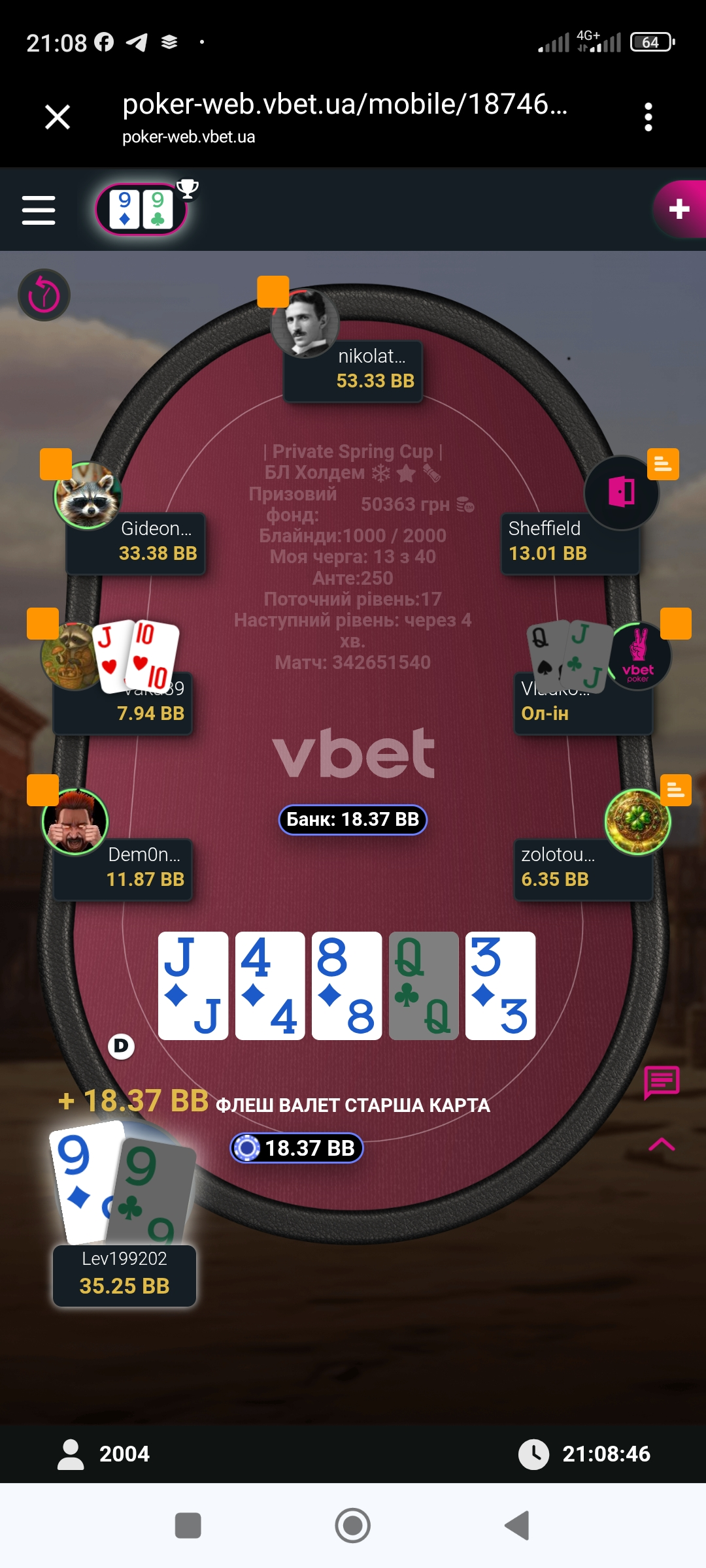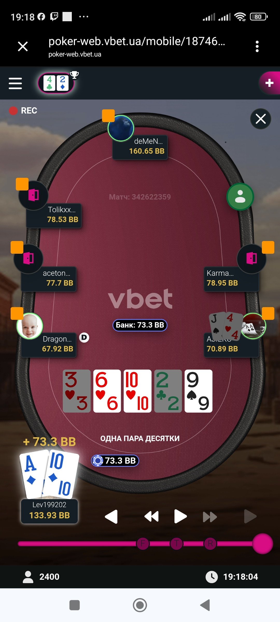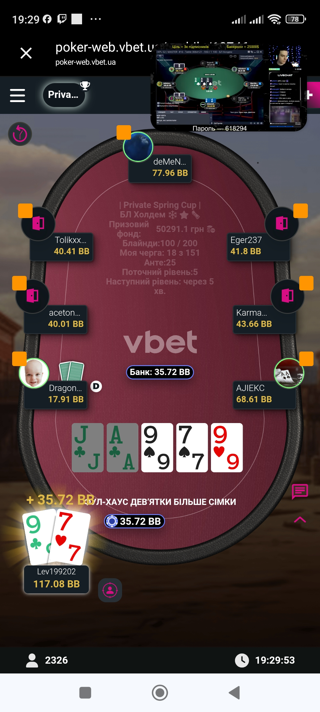 І після цієї роздачі карта мені вже нормальна і не заходила, і ще недовго почекавши я запушив з ВБ, та нажаль Анатолій зібрав сильнішу комбінацію