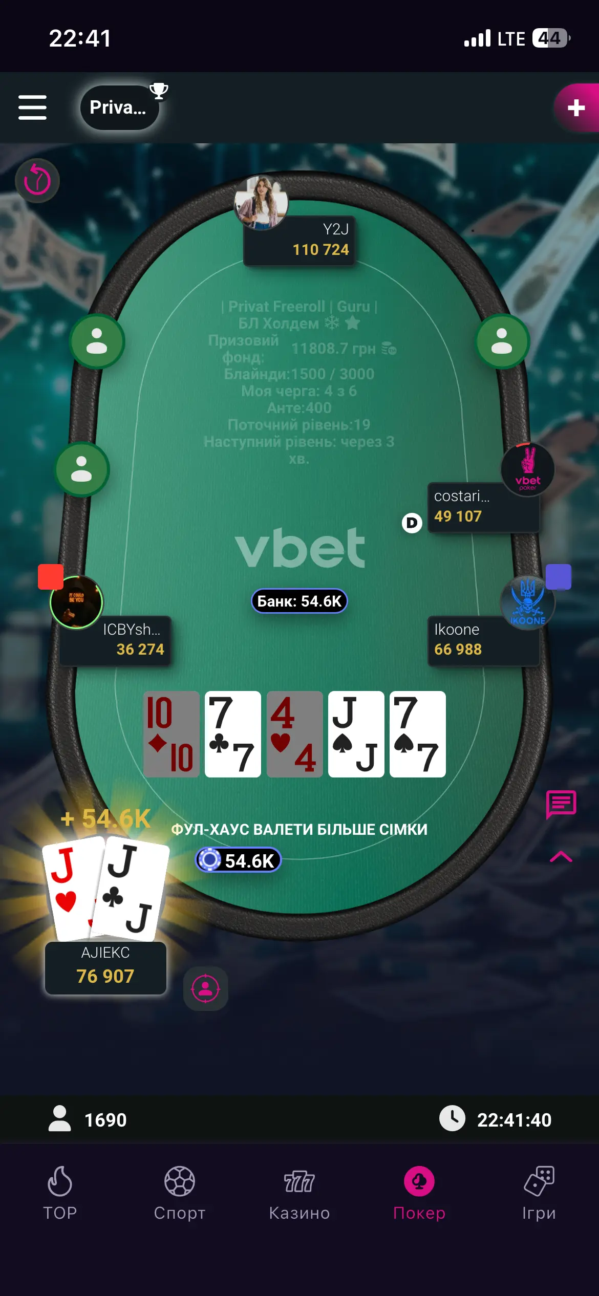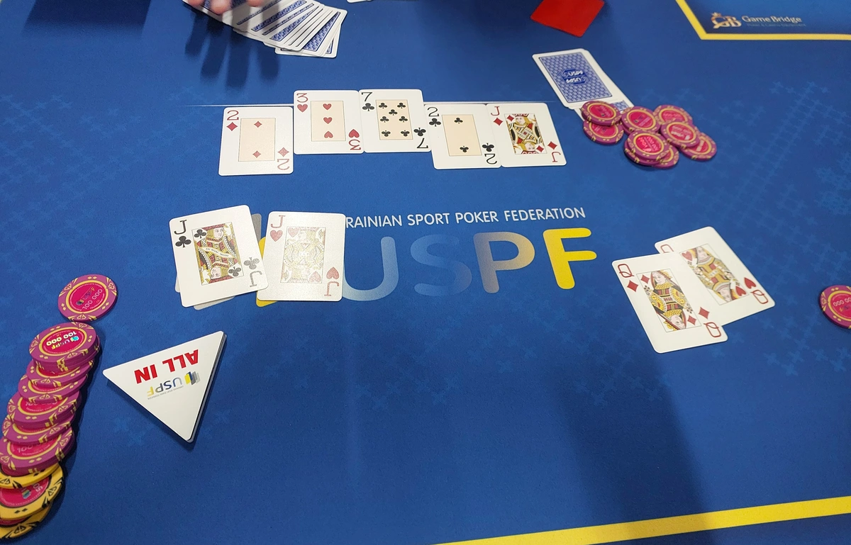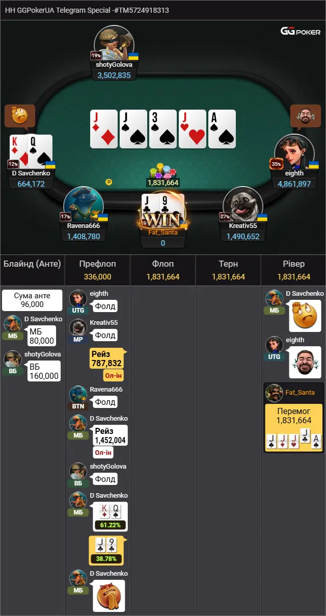 1️⃣Спортсмен залімпив з UTG, з BU пішов рейз, в спорстмена на BU залишалось 15бб в стеку і я запушив свої JJ, на терні наловив сет, але рівер-шулер сказав: Допобачення-Євробачення😁