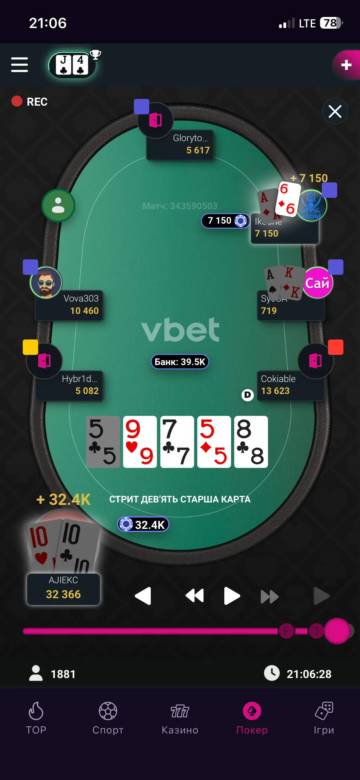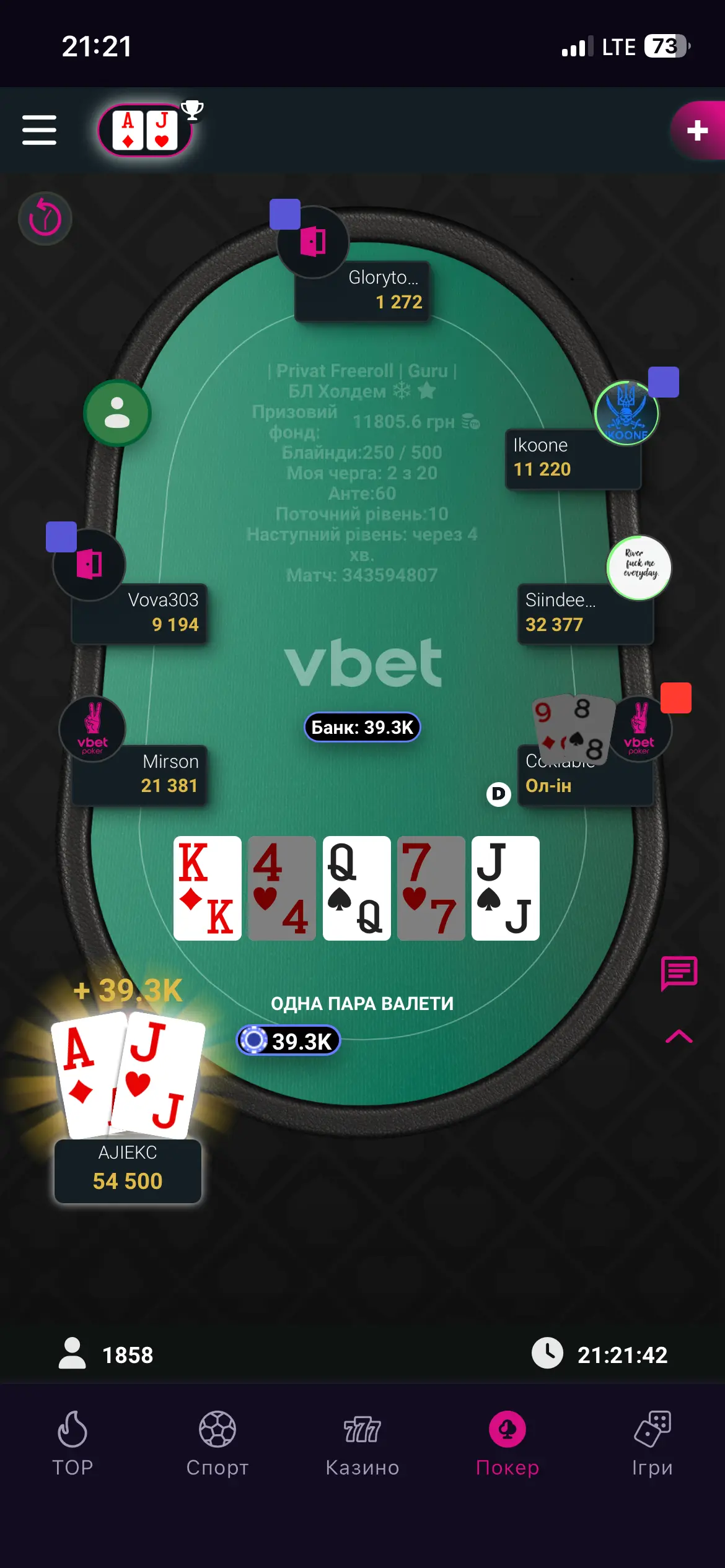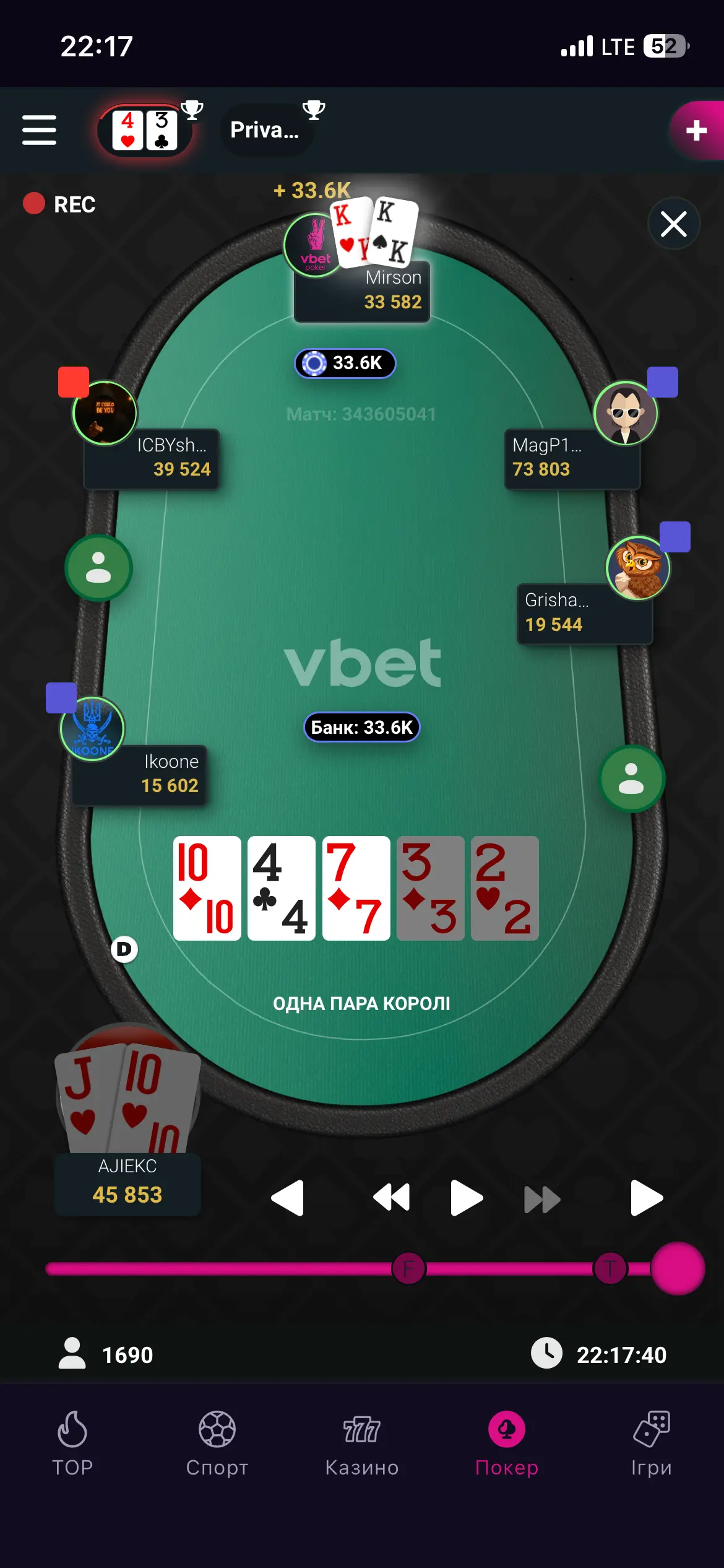 Грав сьогодні достойно показав не поганий рівень, за весь час зловив гарні два каре (дам та королів) за які опоненти проплатили і фішками і сльозами. Каре Дам нажаль не зафіксував. За всю гру вибив понад 10 гравців.