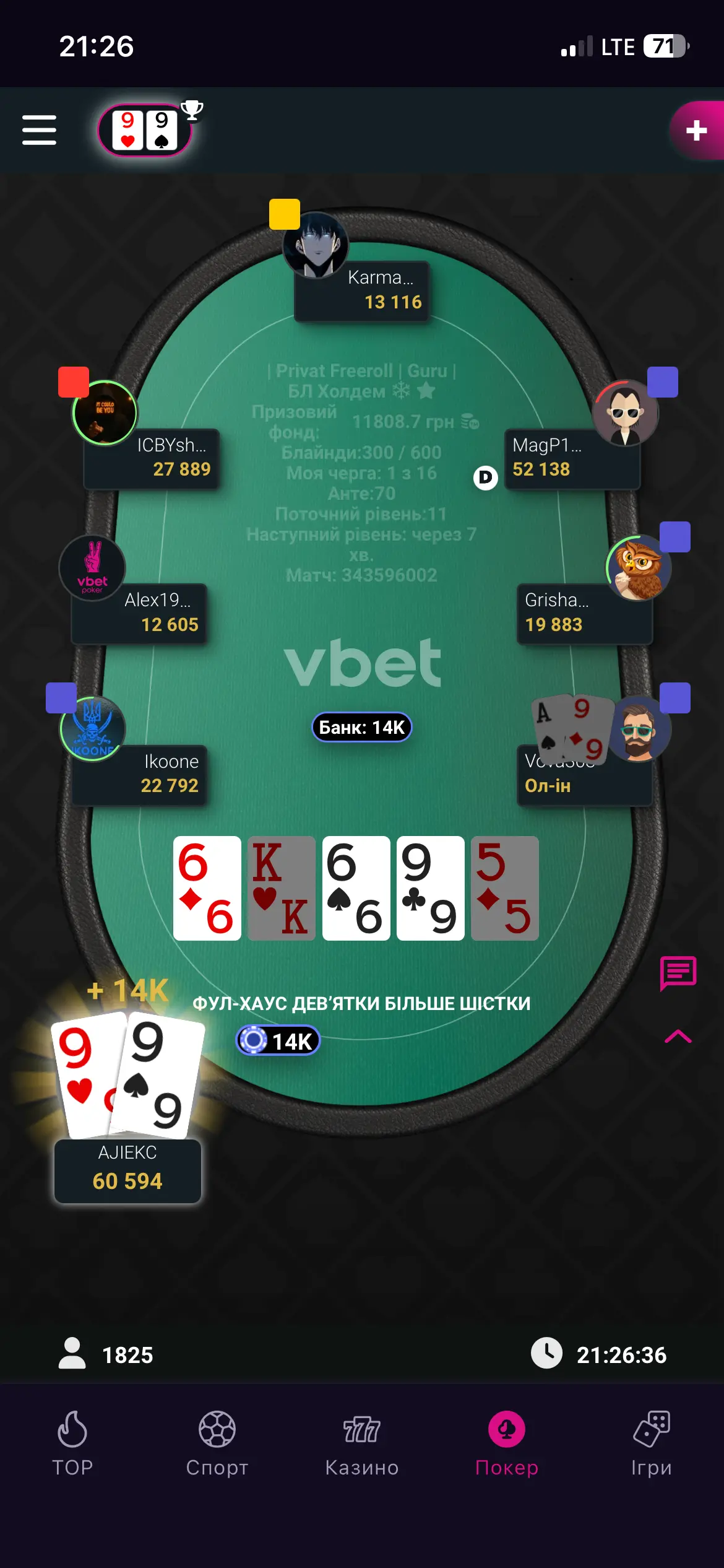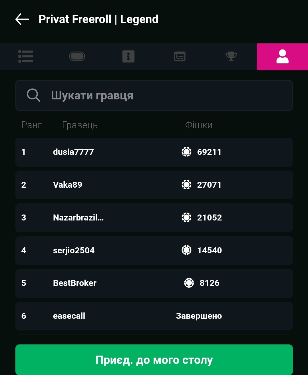 В турнірі нас залишилось 9 гравців, звісно я серед них, не чіпак однак тримаюсь.