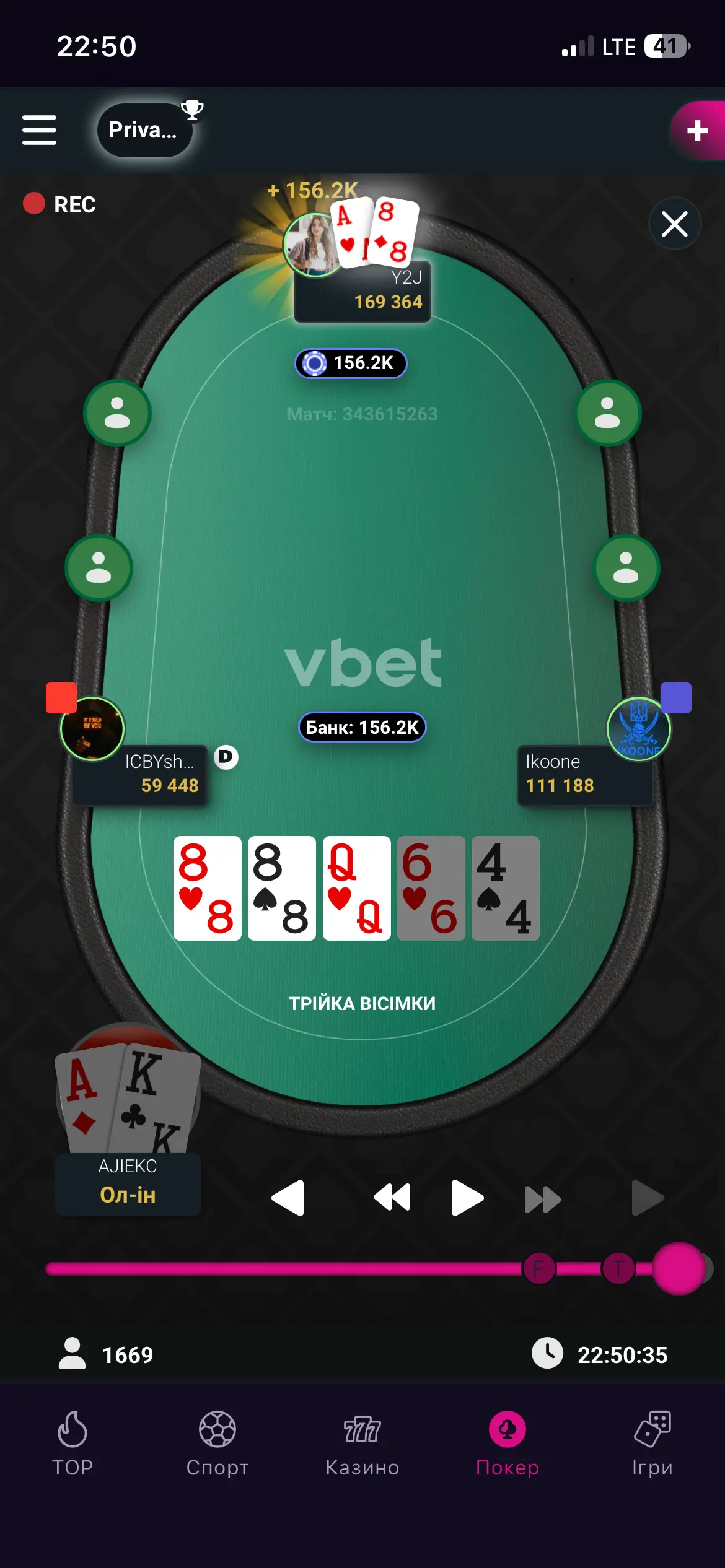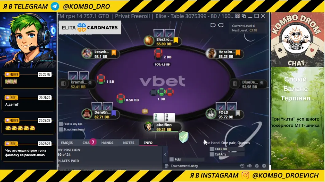 - Комбо, шо робиш? Ми і так тебе виб'ємо, або карти закрий - або затримку включи 😂Ну, то мілкі трабли, були виправлені, дякую за фейрплей, мене дійсно "винесли" з моїми КК проти JQos, але саме моя участь в цьому турнірі не була головним моментом - головним було відображати те, що відбувається за трьома столами в верхньому дивізіоні ліг.
