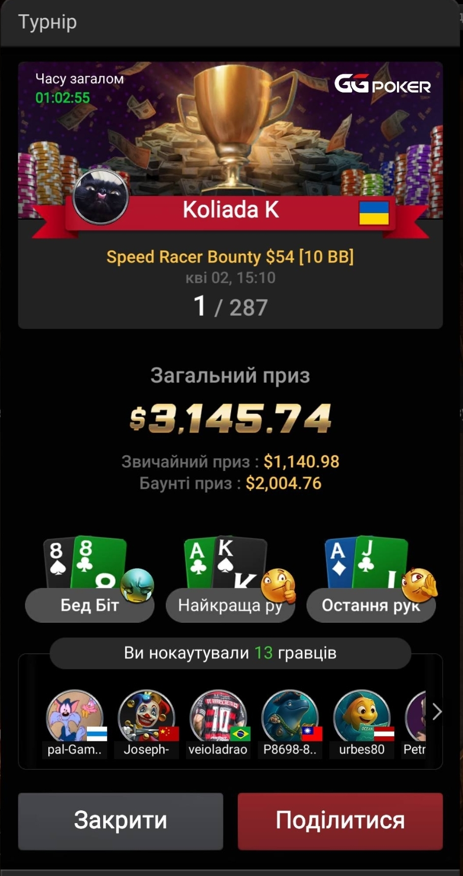 🎯 З цього турніру все почалось... Де мені вдалось вибити стрімера Kuznevychk, та отримати квиток за його голову 54$, який через два тижні перетворився на Т$50, які я успішно відіграв в спінах, але про спіни в іншому блозі, в березні я їх награвся досхочу😅