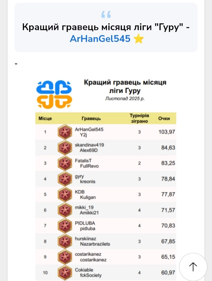 Кращий гравець місяця ліги "Гуру" - ArHanGel545 ⭐️ листопад 2025