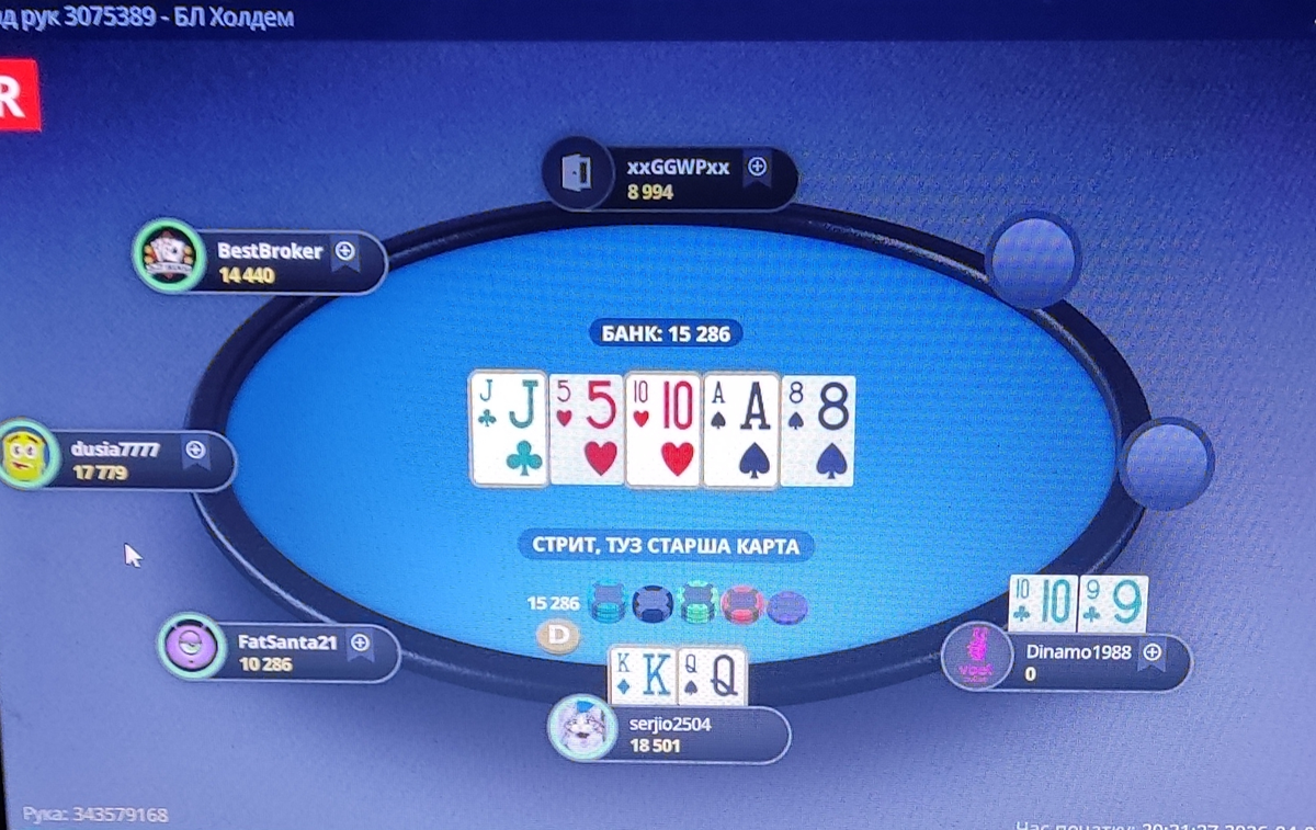 Далі наступила моя фінальна роздача - суперник на утг відкрився з відносно великим стеком, я вирішив впихнути свого оленя з A8s 7bb на що отримав кол з AQo🙃