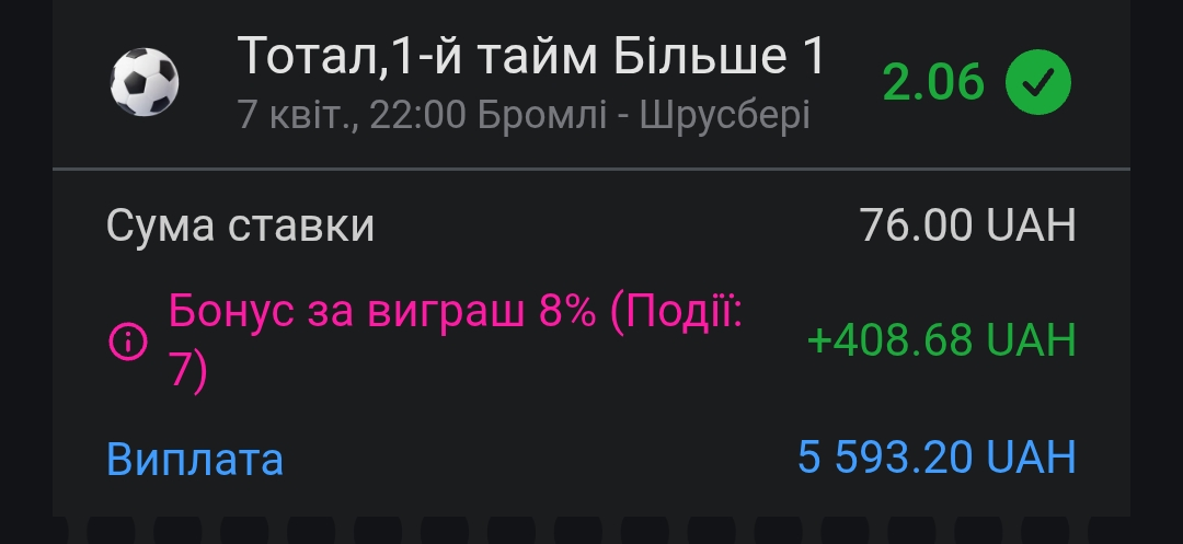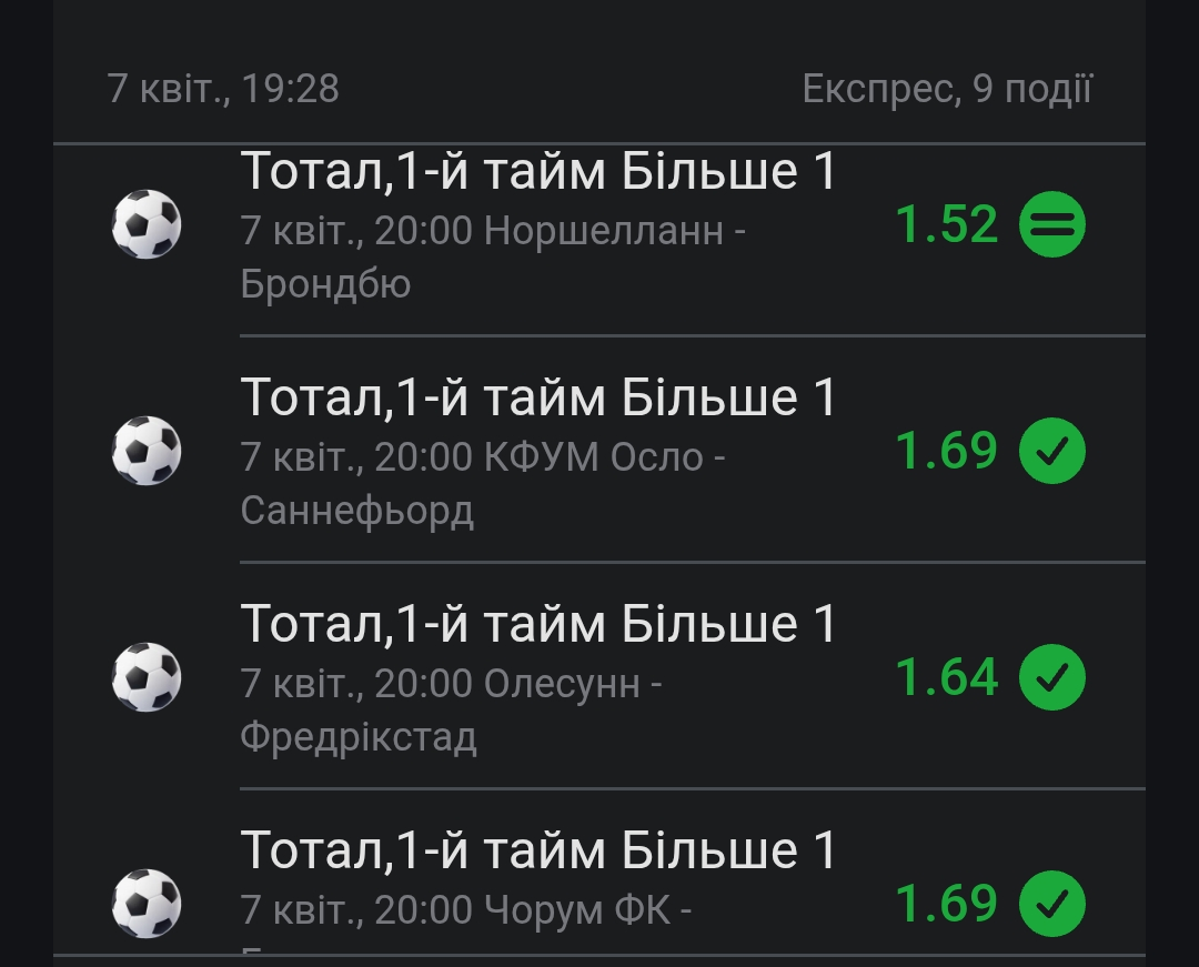 Думаю, ну окей, спробую удачу, все одно халява 😄 🎰 Захожу у Windfall і що ви думаєте? З цього квитка піднімаю 150 грн. Уже непогано, як для старту з нуля 💸 І тут приходить думка: 👉 А чому б не ризикнути і не зробити щось цікаве? ⚽ Вирішив піти по своїй улюбленій стратегії тотал більше 1 у першому таймі. Обрав одразу кілька матчів, зібрав експрес і поставив ..... І понеслось... 🚀 Пару повернень але всім командам дякую зробили цей експрес повністю зеленим ✅