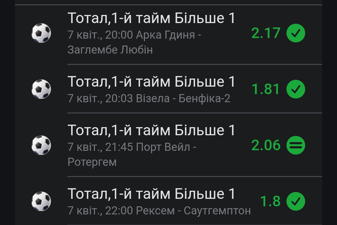 І тут в мене стоїть що Реал Мадрид, Спортинг і ПСЖ забють по 1 голу в кожному таймі, також ці команди мають подати по 3 кутових у кожному таймі, ну а їхні опоненти Баварія, Арсенал і Ліверпуль мають отримати хоча би про одній жавтій карті у кожному таймі. Ну і якщо сказати чесно то навіть я не вірю в такі результати, але команди які пройшли так далеко мають показати нам гарний футбол, в в моєму баченні ще й дуже насичений.