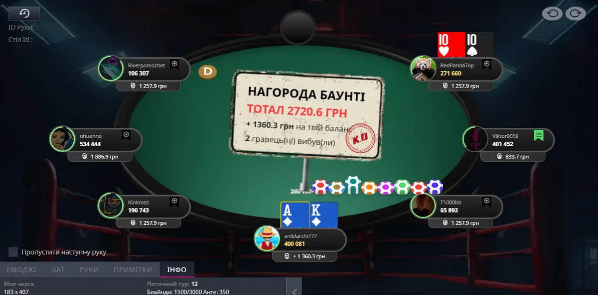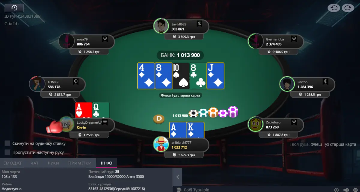 Через 5 годин спітнілої гри наступила довгоочікувана стадія ІТМ🥳 і мені здають AKs на батоні. Всі до мене викинули руки в пас, тому я відкрився 2бб і стрімер LuckyDreamer вирішує на МБ запушити свою руку з 14бб. Я звісно ж кол і ось результат: