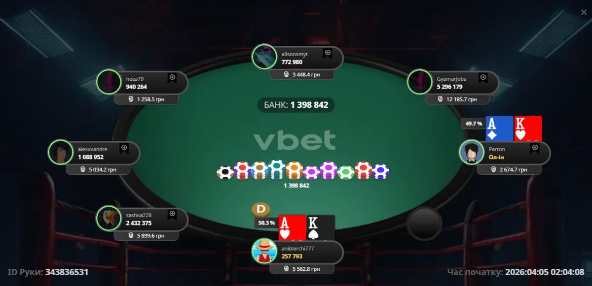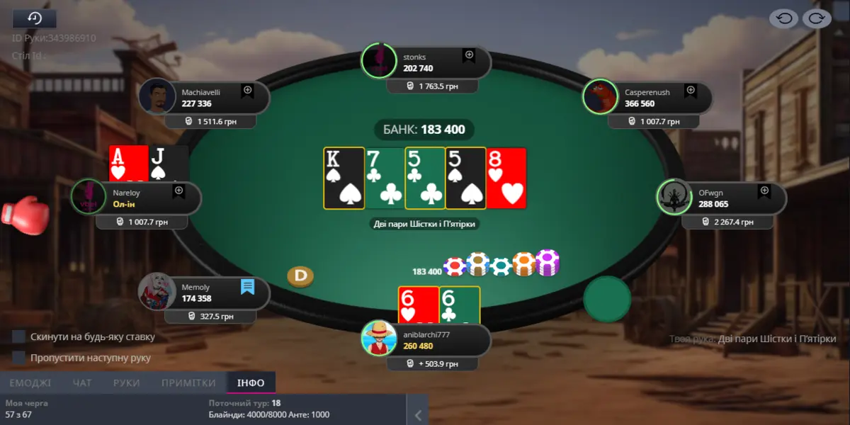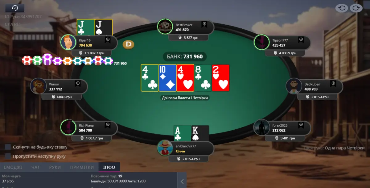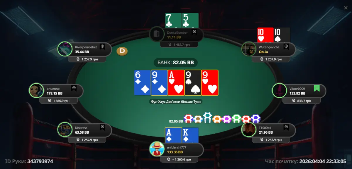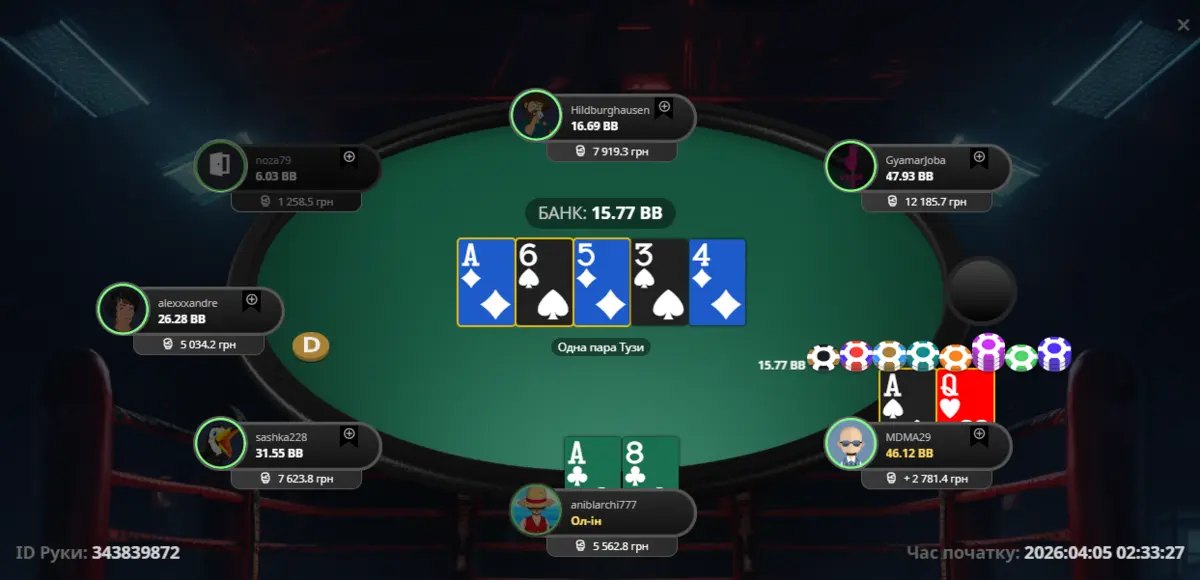 Перейдемо безпосередньо до роздач. Я потрапив у топ пару. З цими опонентами вже відіграв певну кількість рук, тому на їхню ставку я зробив 3бет, після чого отримав All-in. Думаю, зіграв правильно 😅