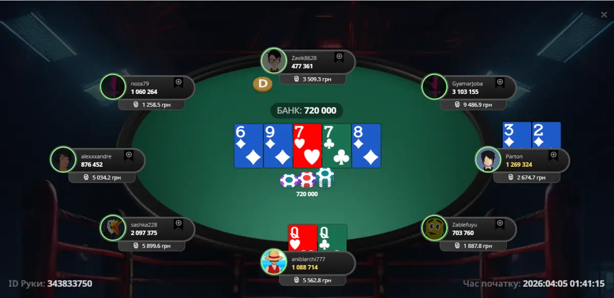 Стіл тільки стартував. Я відкрився, він заколив, і моє здивування було, коли він миттєво поставив All-In. Я подумав, що це може бути блеф або середня пара. У мене була топ пара з непоганим кікером вирішив колити 😉