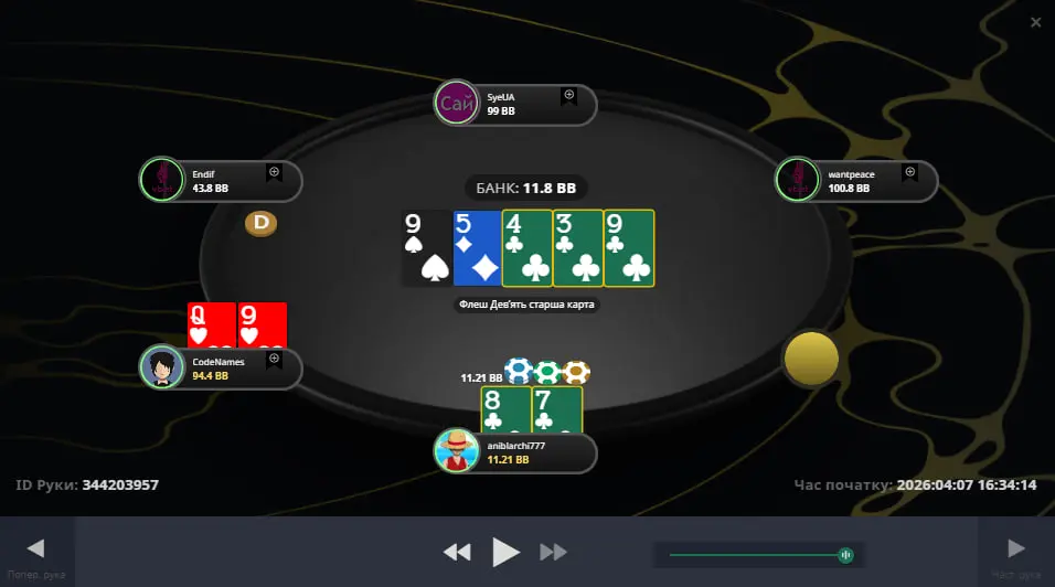 Опонент грав дуже агресивно і часто мав сильну руку. Коли я побачив флоп, дуже зрадів і сподівався що в нього АА. Коли я поставив, а він зробив 3бет, у мене ніби зупинився час. Я був майже впевнений, що туз у нього є, і надіявся на другий. Коли ми відкрились було розчарування, бо очікував іншого 😬