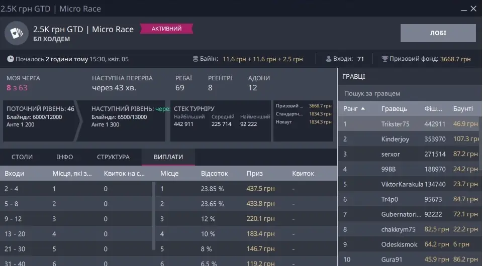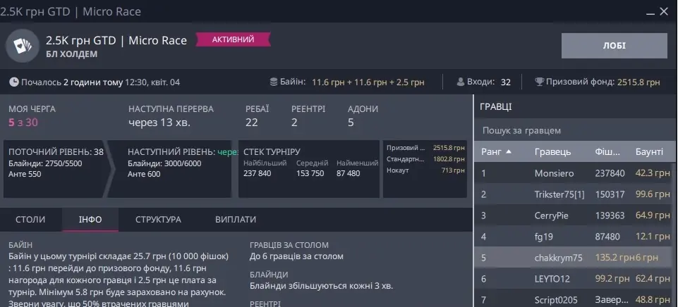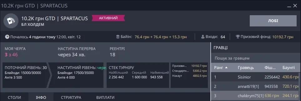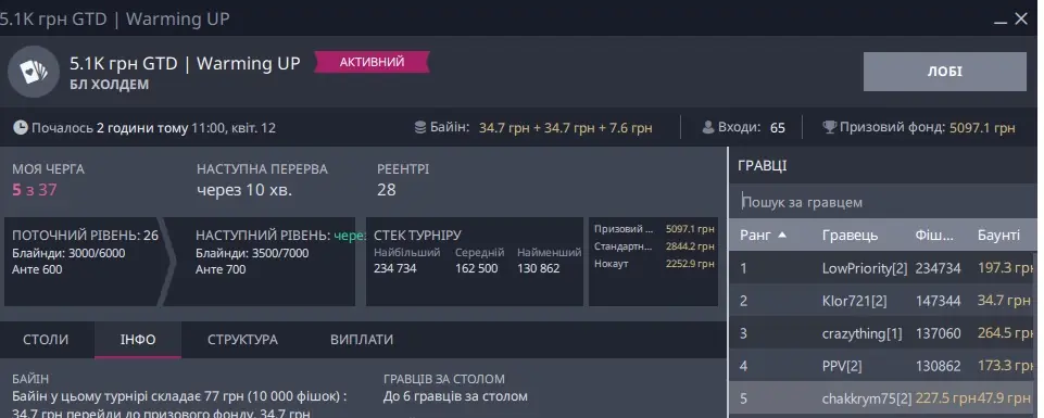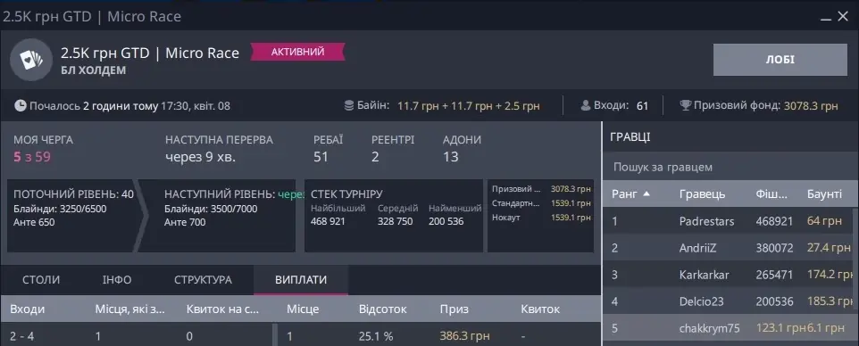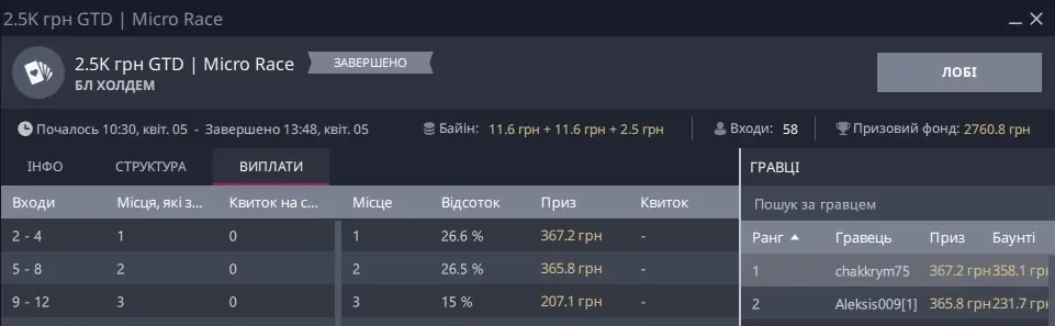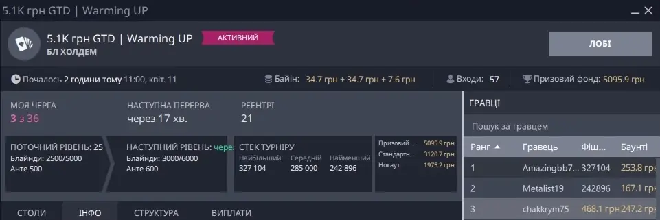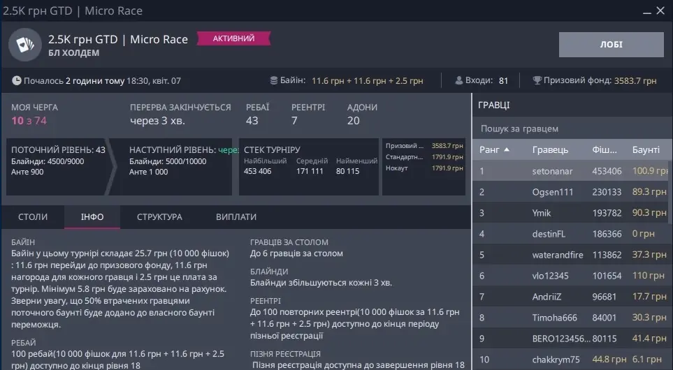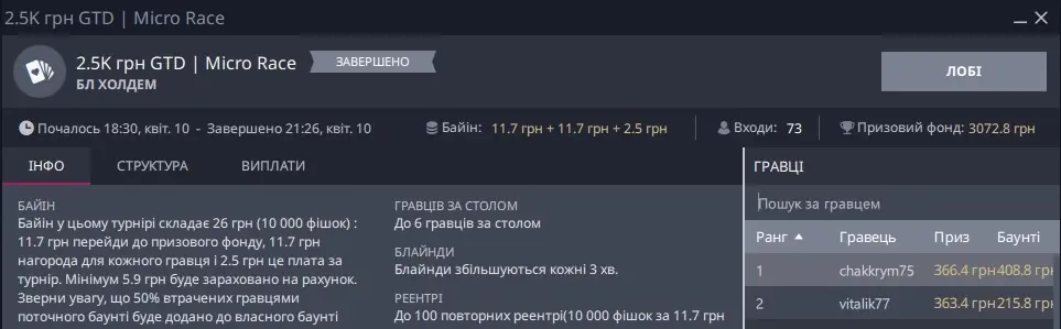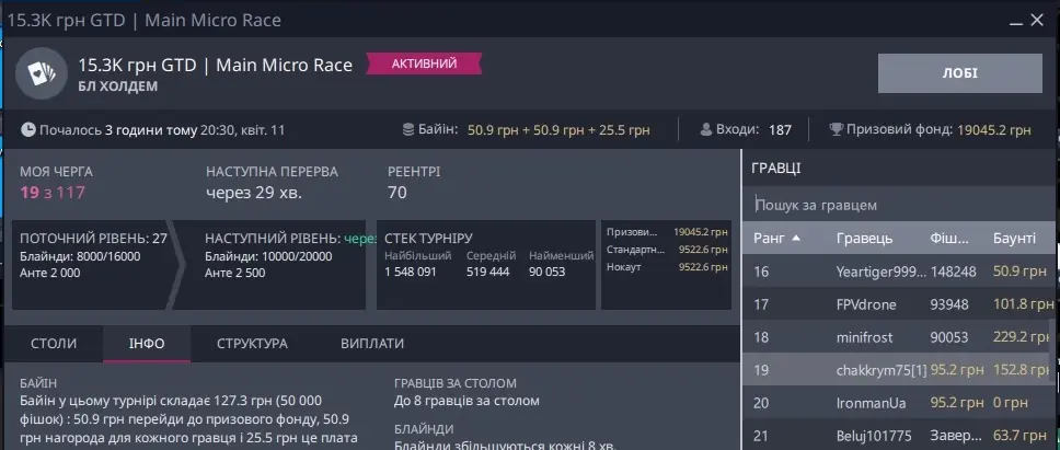 Окремо скрін, де я зарегався піздньою, а це не Холдем, та ще ПЛ, прийшлося триматися і всеж увійти в ІТМ: