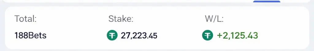 Загалом за цей час було зроблено 188 ставки на загальну суму 27 223$ профіт склав 2 125$