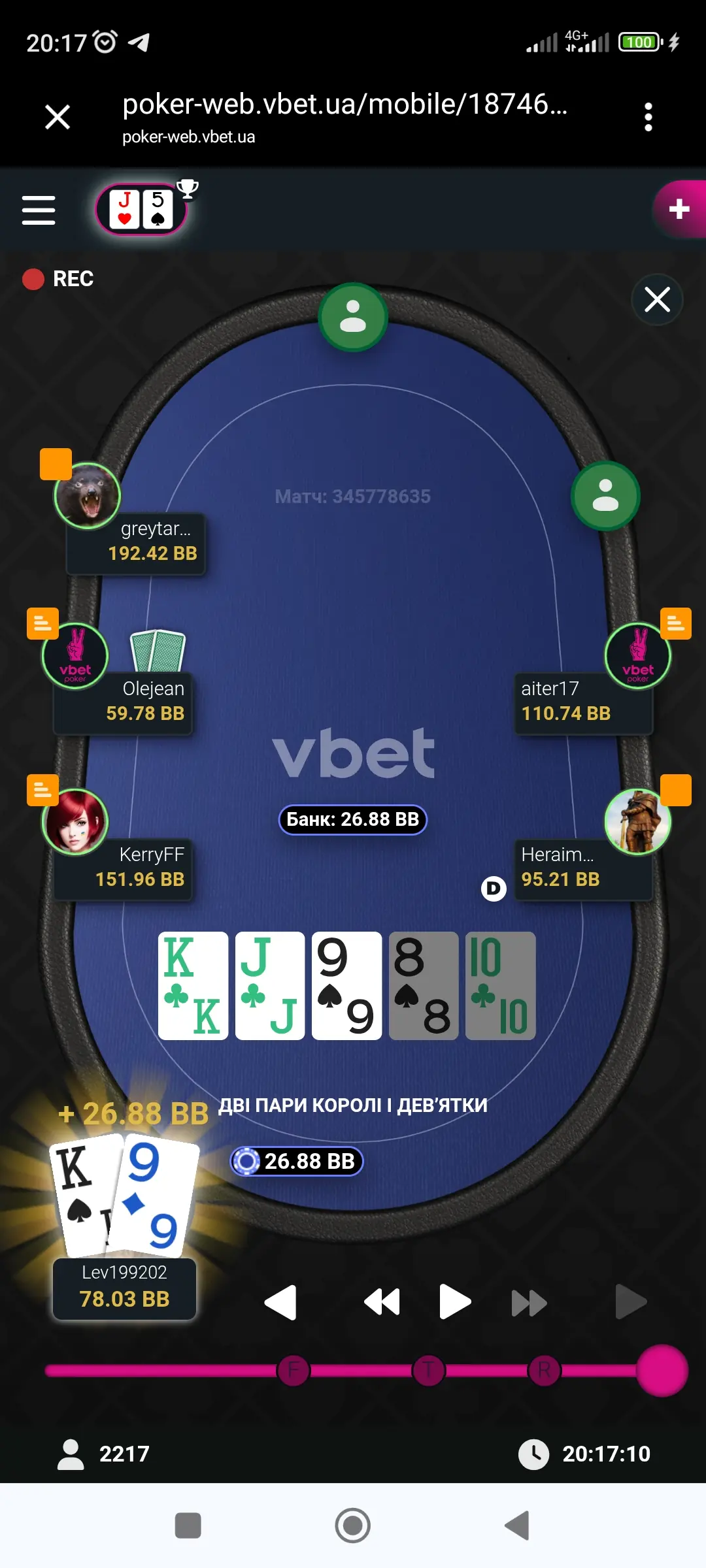 Я так розумію, що і він має на мене нотси, бо грав проти мене обережно, навіть дуже. Я відчув це і почав грати наче в кеш, спочатку я невиликими банками майже вирівняв стеки. Потім він мене упіймав на блефі і все почалось з початку. Наче кішка з мишкою ( мишеня це я).