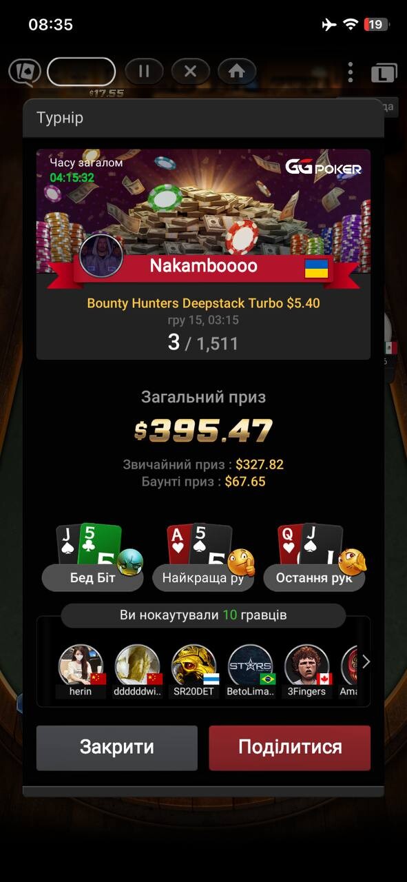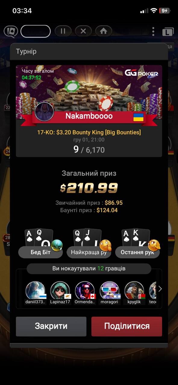І далі мені вдалось все-таки потрапити в ІТМ, ще навіть пересидіти ще один пейджамп, ба більше навіть були шанси вийти у ХА, але пан sharan1927 показав справжню майстерність розкрутки з 1 чи 2х бб і я фінішував на 3му місці, що вважаю теж досить непогано