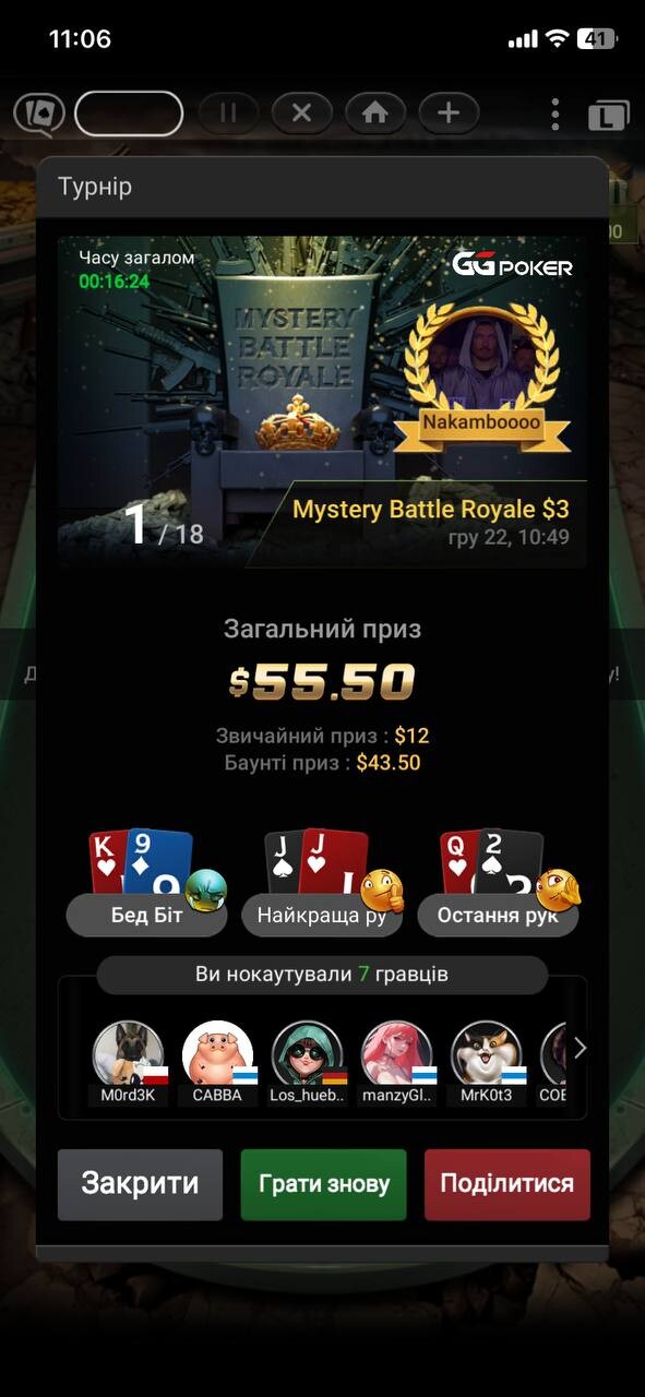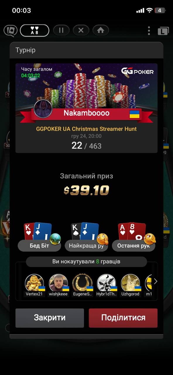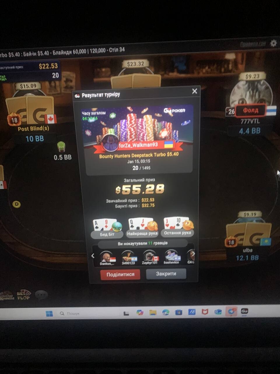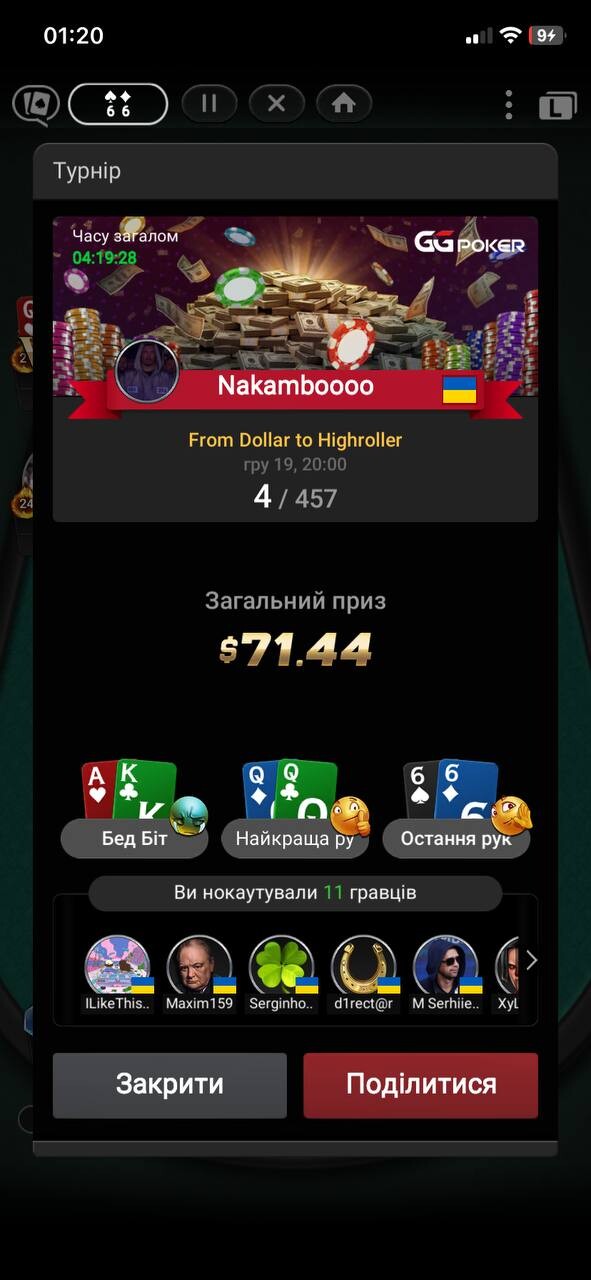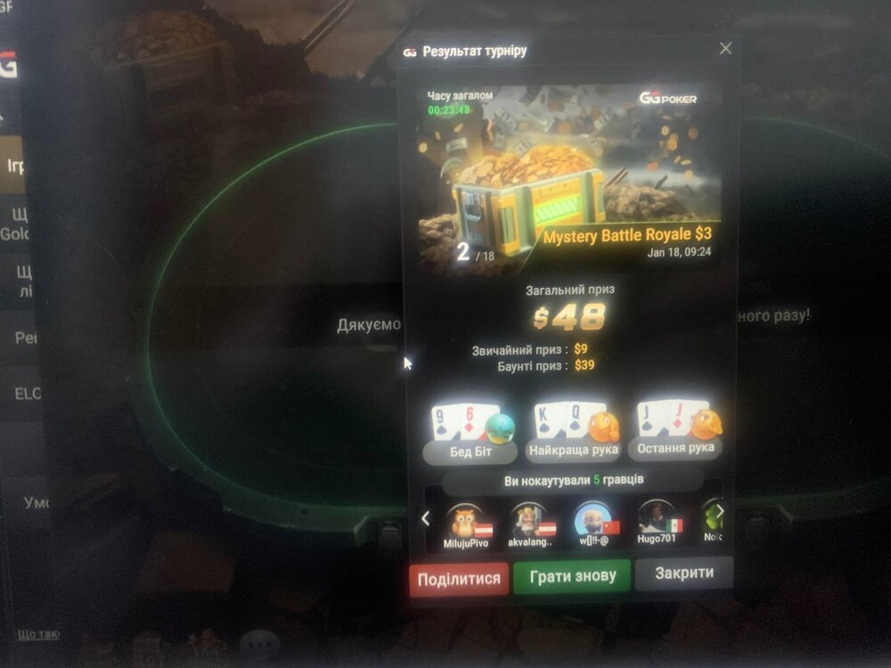 Всім дякую за гру, було досить цікаво і емоційно ) В плані покеру на жаль більше немає що розповісти, тому що на даний час - покер на паузі, крім хомок звісно.