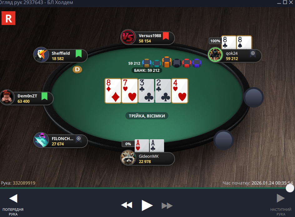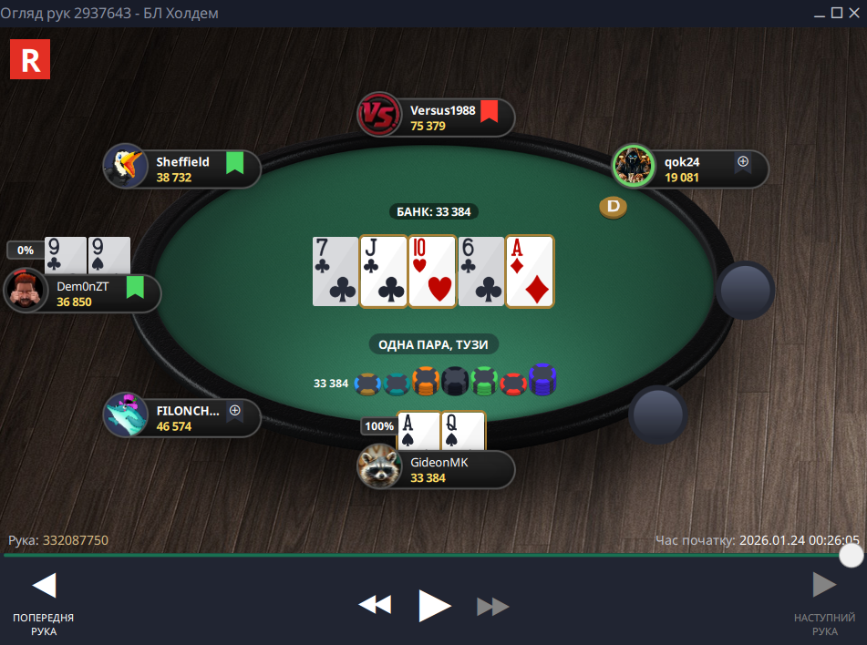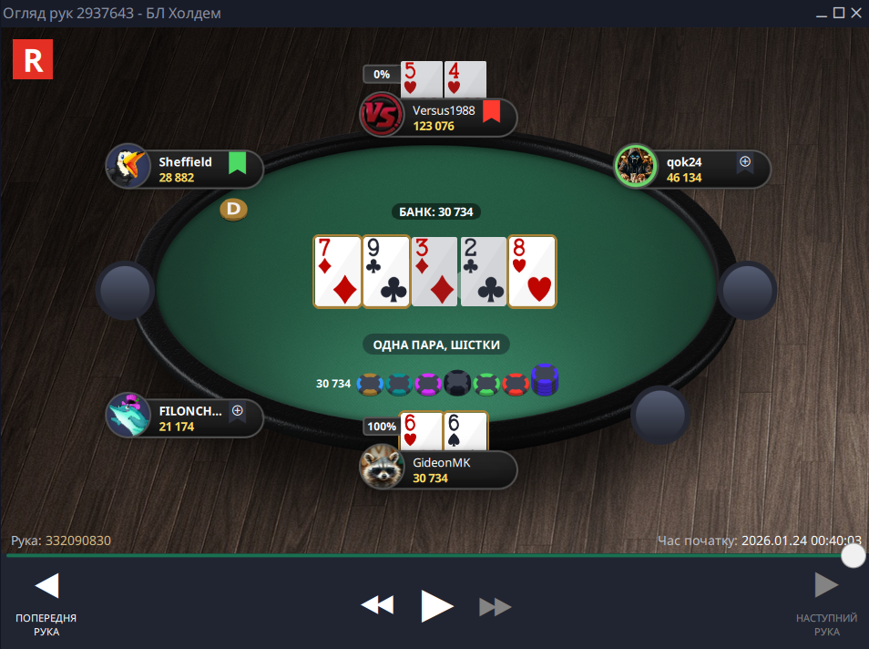 Наступний момент до кінця не пам'ятаю,як від початку розвивалась ситуація...але поїхали префлоп проти Versus1988 , доволі вдало 🤩